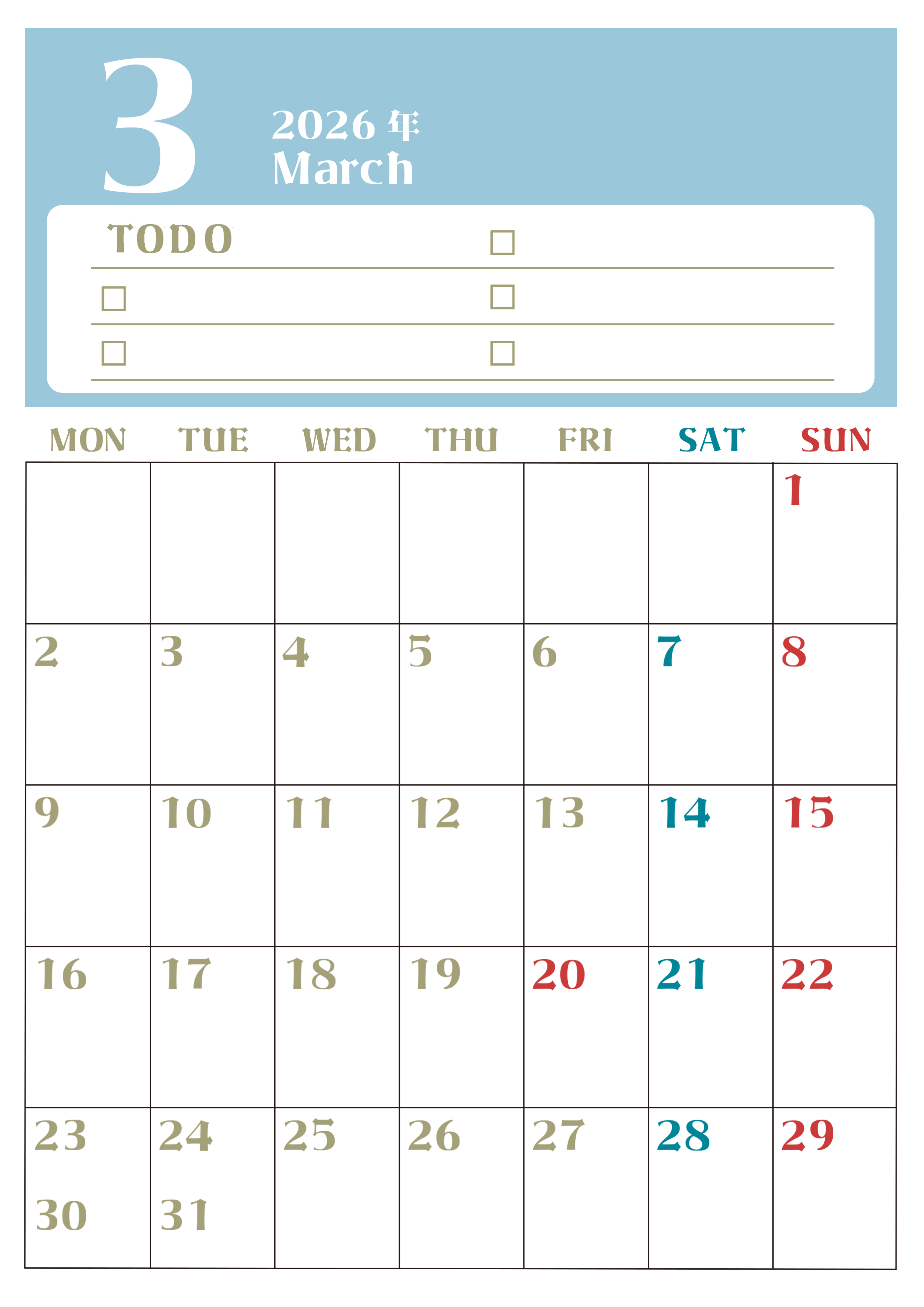 2026年3月カレンダーは縦型月曜始まり♪ToDoリストで勉強や自己啓発の継続を/A4無料(2026-01450311)