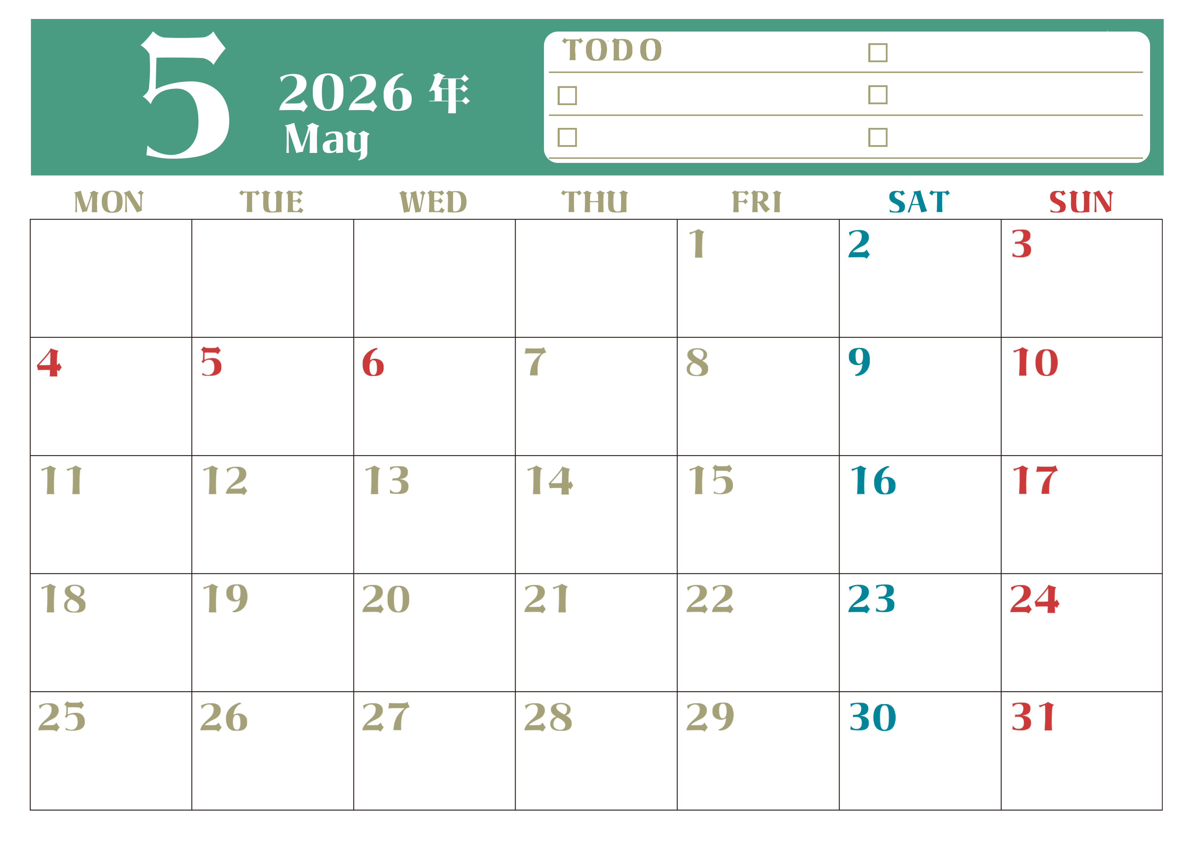 2026年・無料のカレンダーテンプレート 2026年5月カレンダーは横型月曜始まり♪ToDoリストで勉強や自己啓発の継続を/A4無料(2026-01450501) 素材状デザイン王 2025年4月12日 2026年5月カレンダーは横型月曜始まりです。ToDoリストで勉強や自己啓発の継続を心がけましょう。A4サイズで無料です。(2026-01450501) 5月 横型のカレンダー 月曜始まり ToDoリスト カレンダーデザイン-0145