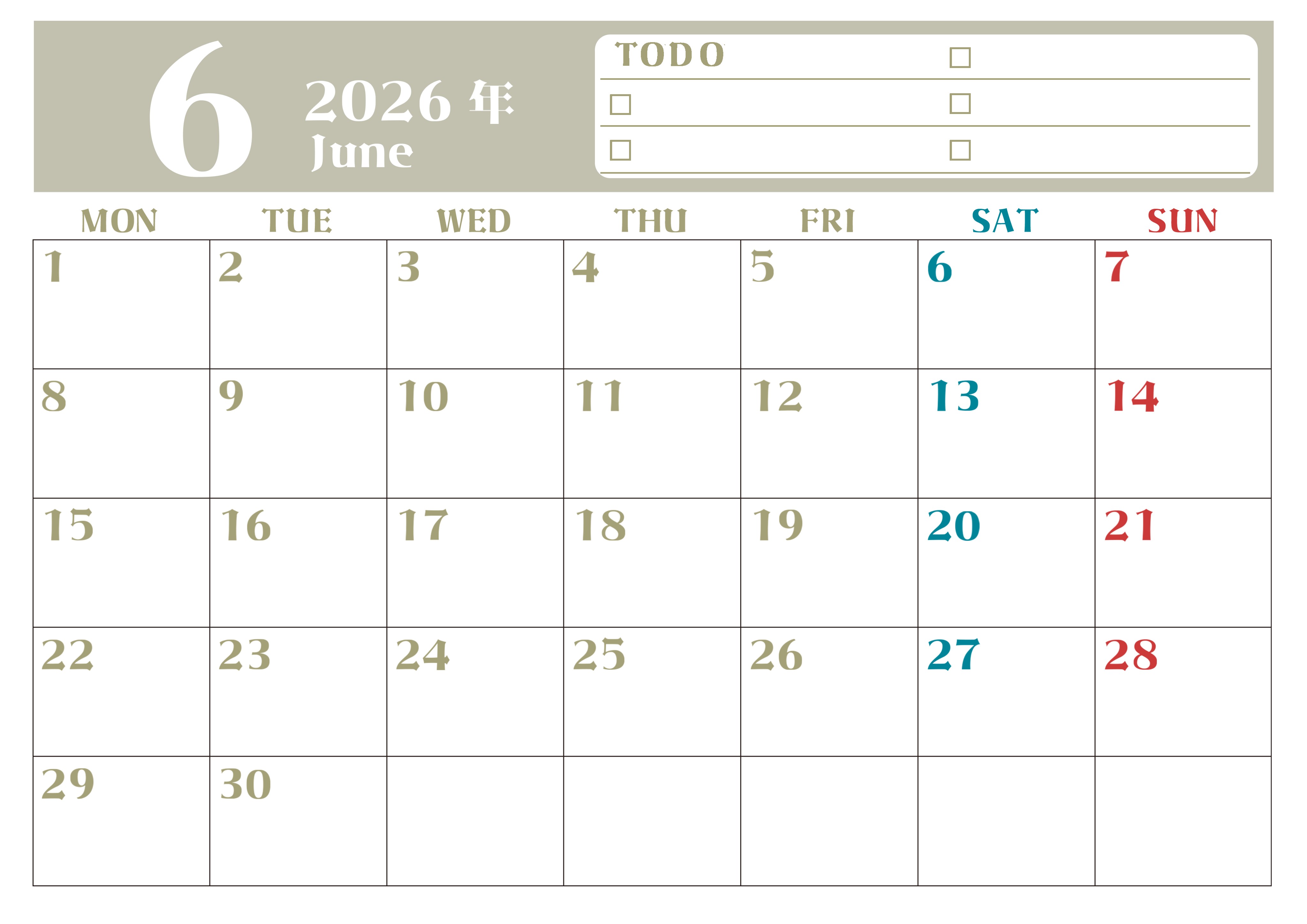 2026年6月カレンダーは横型月曜始まりです。ToDoリストで勉強や自己啓発の継続を心がけましょう。A4サイズで無料です。(2026-01450601)