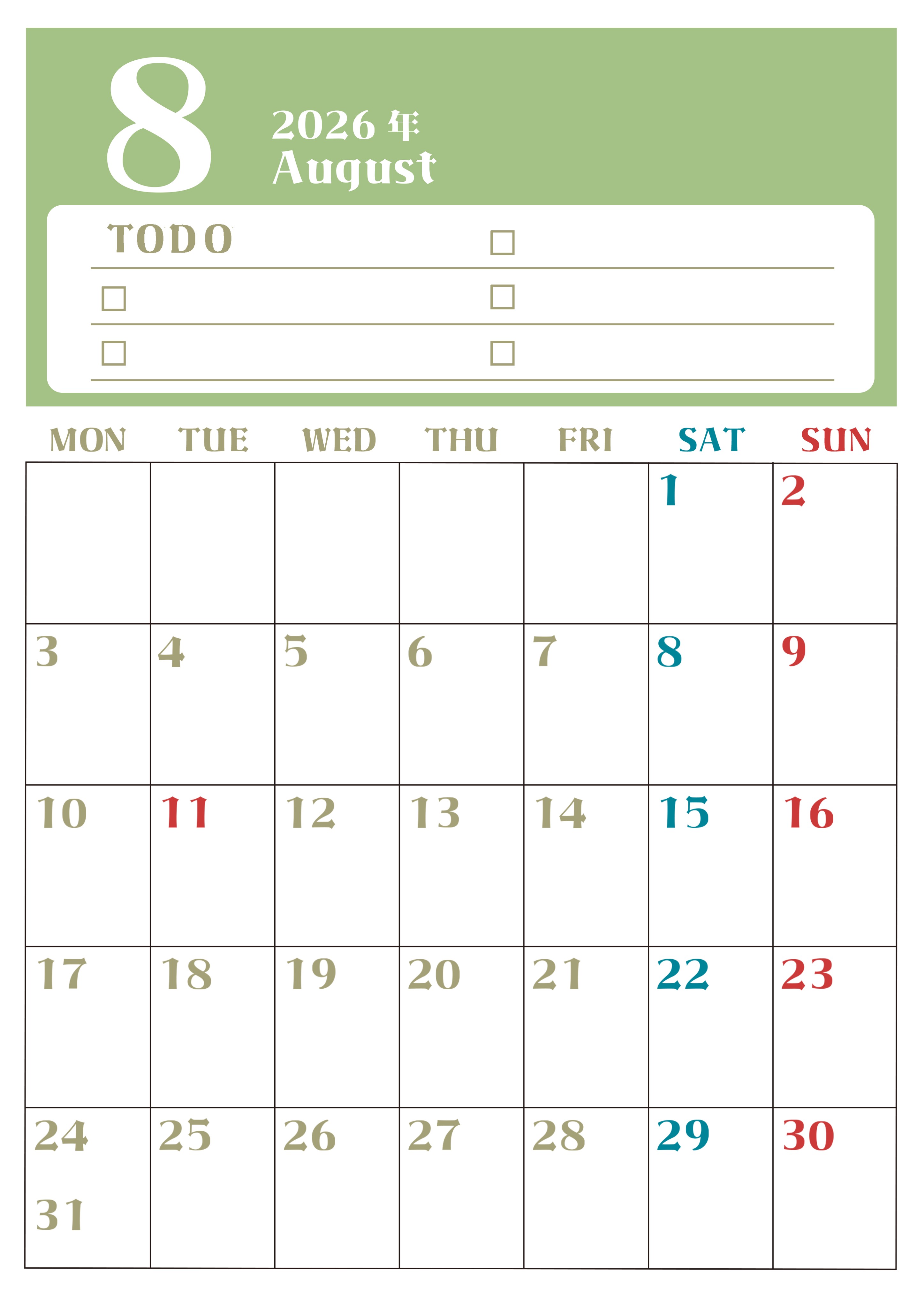 2026年8月カレンダーは縦型月曜始まりです。ToDoリストで勉強や自己啓発の継続を心がけましょう。A4サイズで無料です。(2026-01450811)