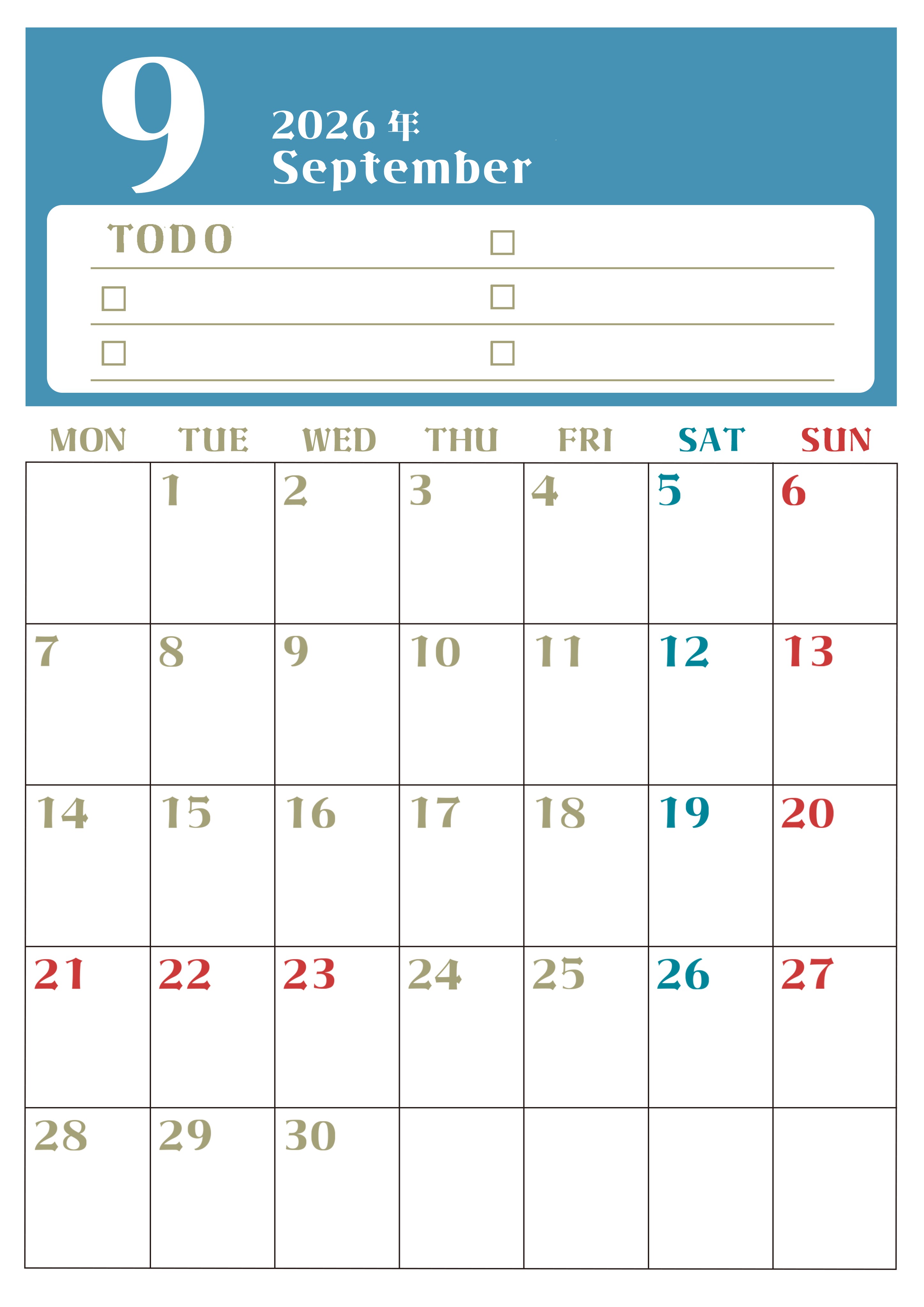 2026年・無料のカレンダーテンプレート 2026年9月カレンダーは縦型月曜始まり♪ToDoリストで勉強や自己啓発の継続を/A4無料(2026-01450911) 素材状デザイン王 2025年4月12日 2026年9月カレンダーは縦型月曜始まりです。ToDoリストで勉強や自己啓発の継続を心がけましょう。A4サイズで無料です。(2026-01450911) 9月 縦型のカレンダー 月曜始まり ToDoリスト カレンダーデザイン-0145