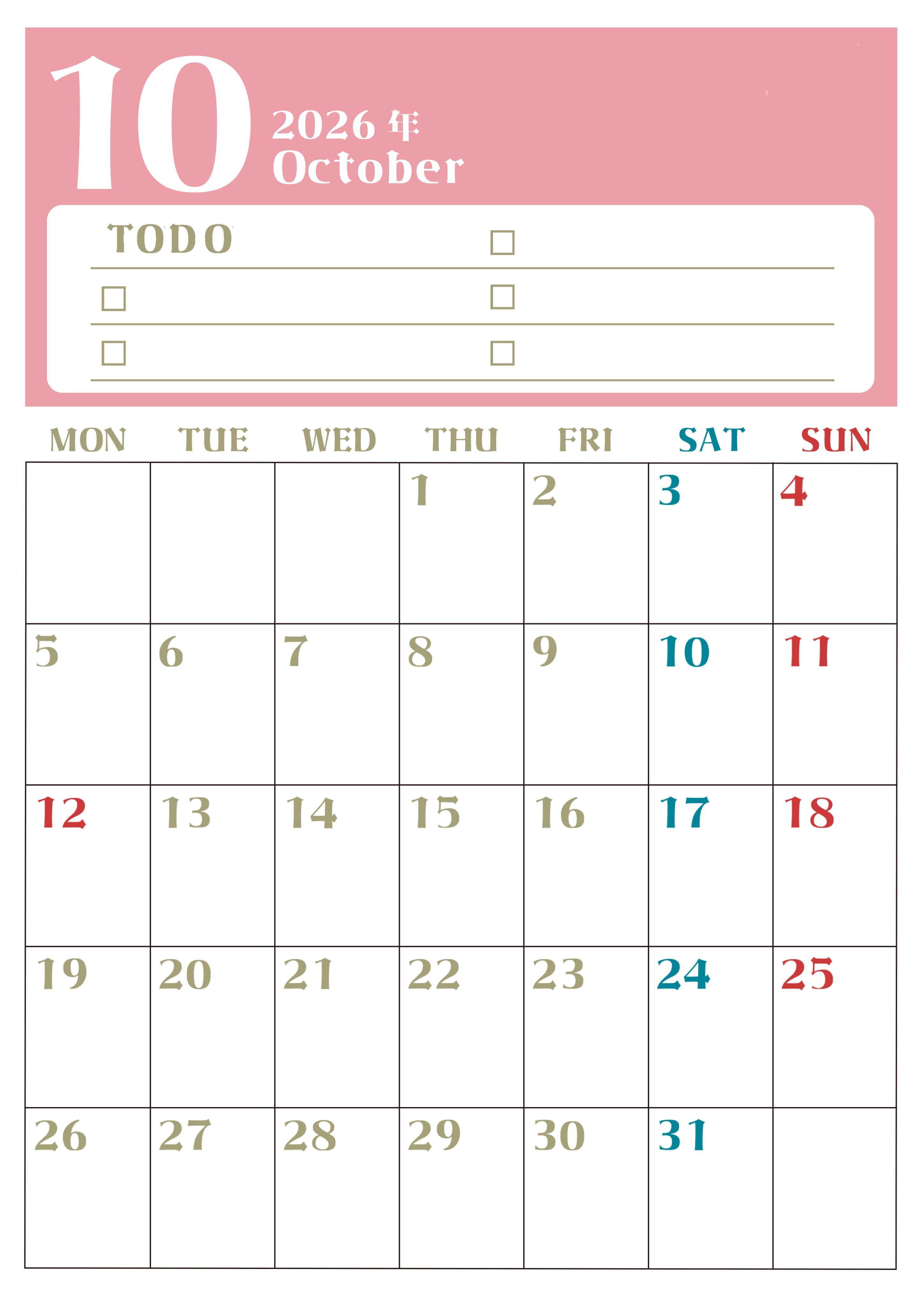 2026年・無料のカレンダーテンプレート 2026年10月カレンダーは縦型月曜始まり♪ToDoリストで勉強や自己啓発の継続を/A4無料(2026-01451011) 素材状デザイン王 2025年4月12日 2026年10月カレンダーは縦型月曜始まりです。ToDoリストで勉強や自己啓発の継続を心がけましょう。A4サイズで無料です。(2026-01451011) 10月 縦型のカレンダー 月曜始まり ToDoリスト カレンダーデザイン-0145