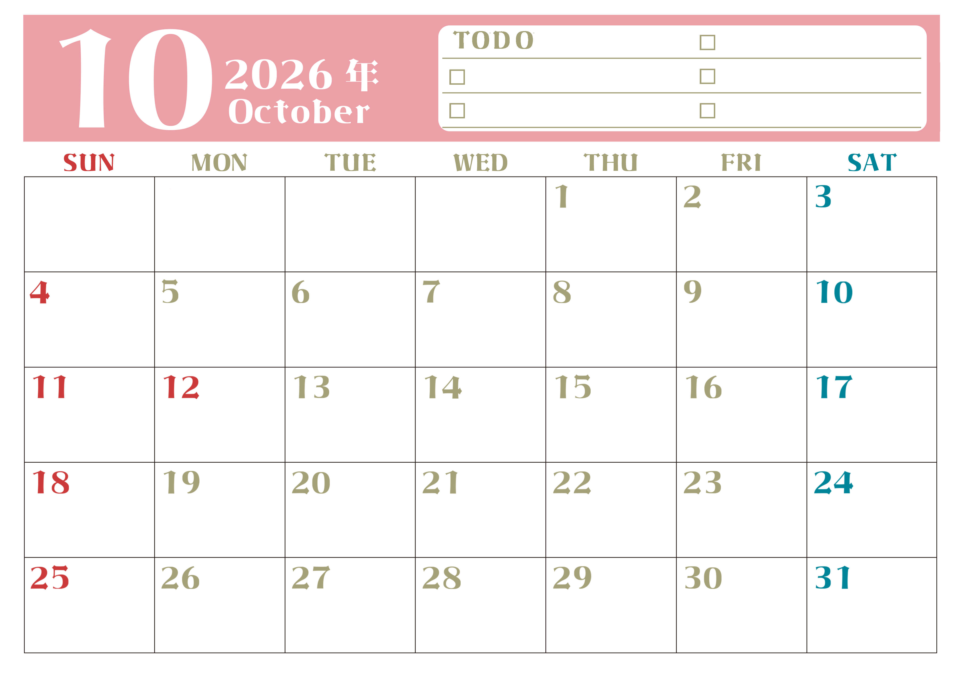 2026年・無料のカレンダーテンプレート 2026年10月カレンダーは横型日曜始まり♪ToDoリストで勉強や自己啓発の継続を/A4無料(2026-01451000) 素材状デザイン王 2025年4月12日 2026年10月カレンダーは横型日曜始まりです。ToDoリストで勉強や自己啓発の継続を心がけましょう。A4サイズで無料です。(2026-01451000) 10月 横型のカレンダー 日曜始まり ToDoリスト カレンダーデザイン-0145