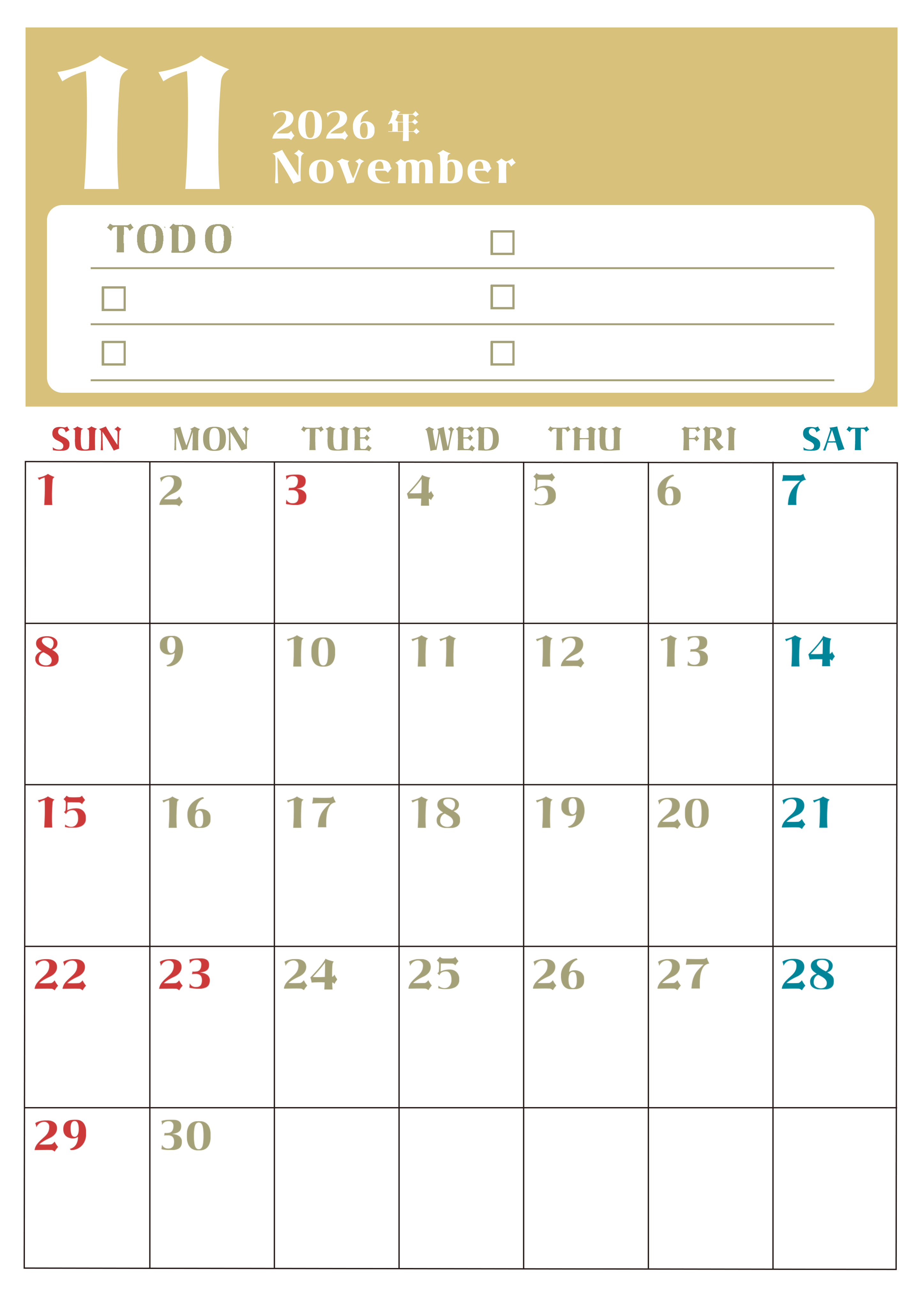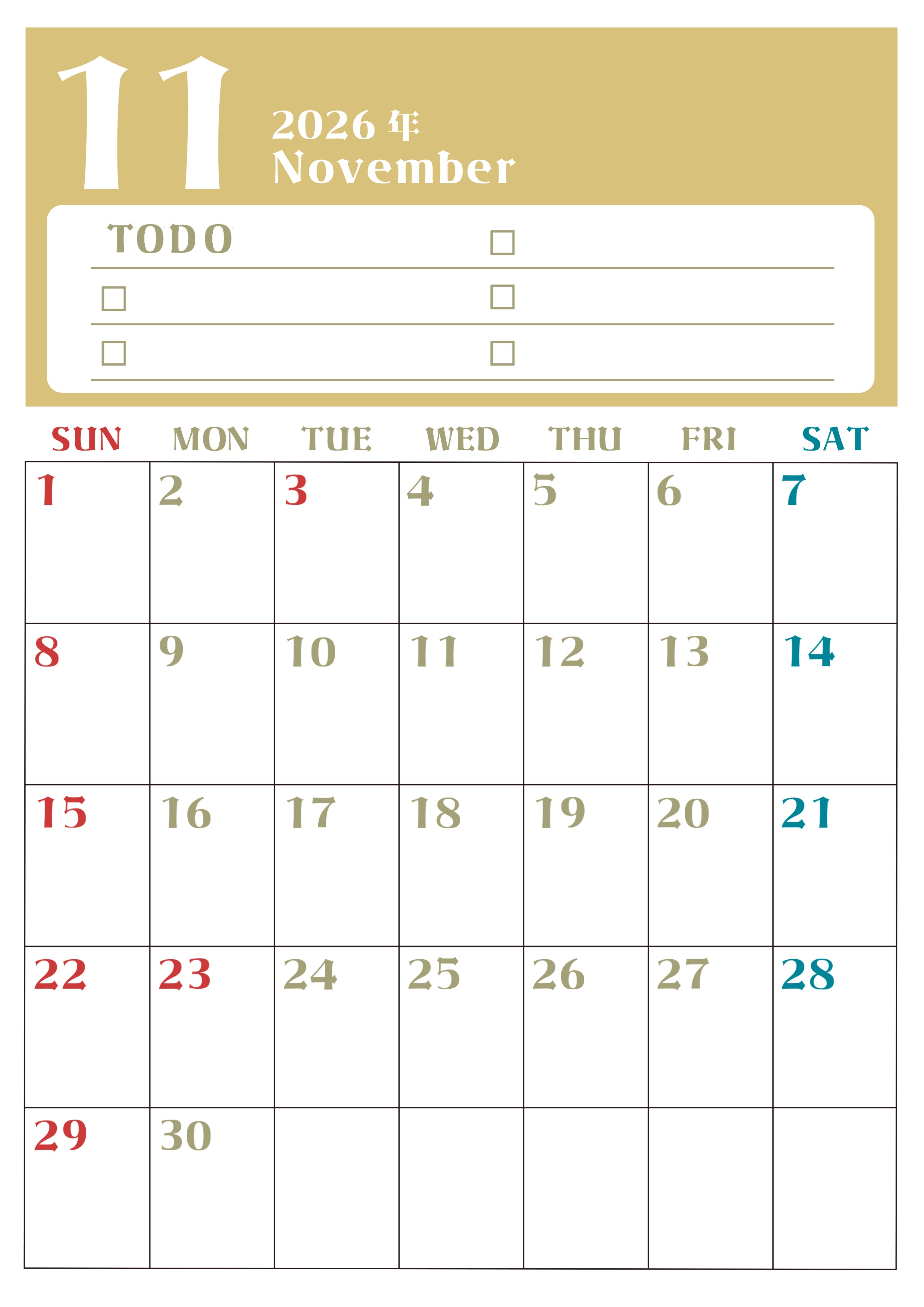 2026年11月カレンダーは縦型日曜始まりです。ToDoリストで勉強や自己啓発の継続を心がけましょう。A4サイズで無料です。(2026-01451110)