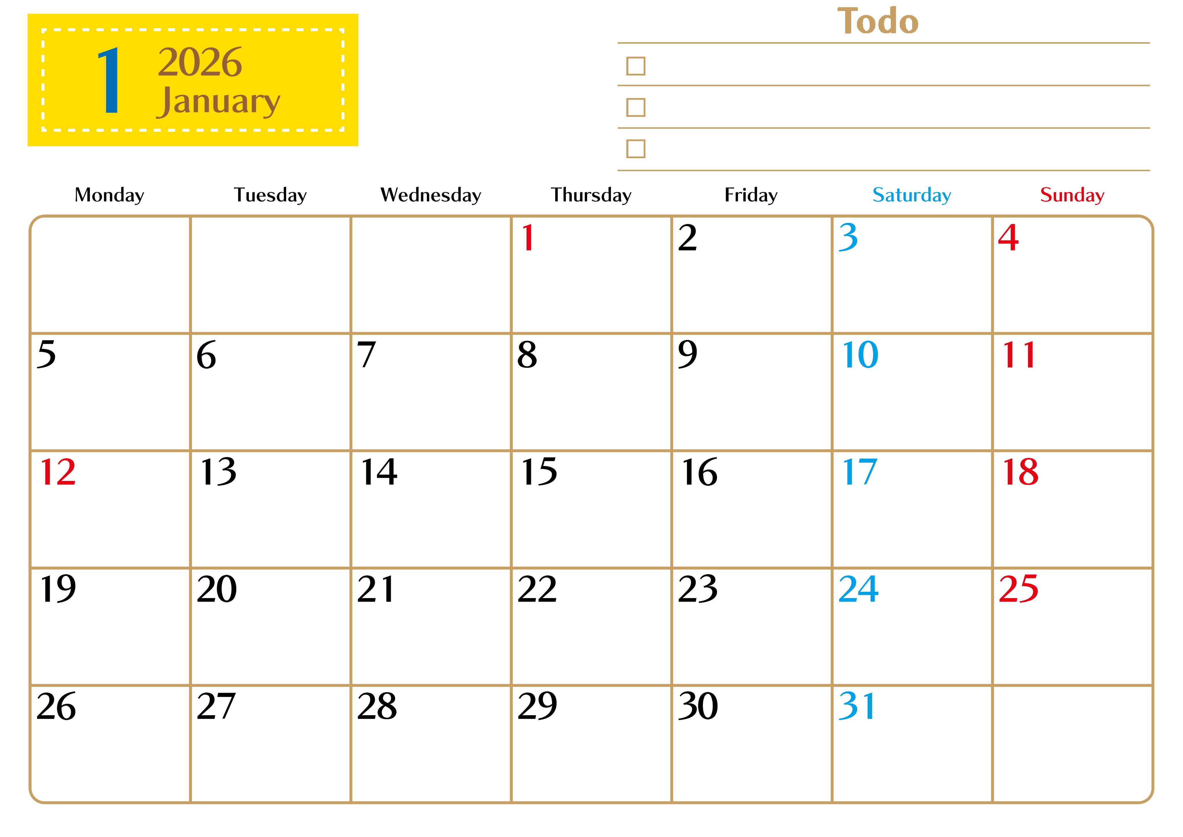 2026年・無料のカレンダーテンプレート 2026年1月カレンダーは横型月曜始まりでToDoリストもあるのでスケジュール計画がしやすい:無料(2026-01460101) 素材状デザイン王 2025年4月12日 2026年1月カレンダーは横型月曜始まりでToDoリストもあるのでスケジュール計画がしやすいです。無料にてダウンロードをして印刷利用しましょう。(2026-01460101) 1月 横型のカレンダー 月曜始まり ToDoリスト カレンダーデザイン-0146