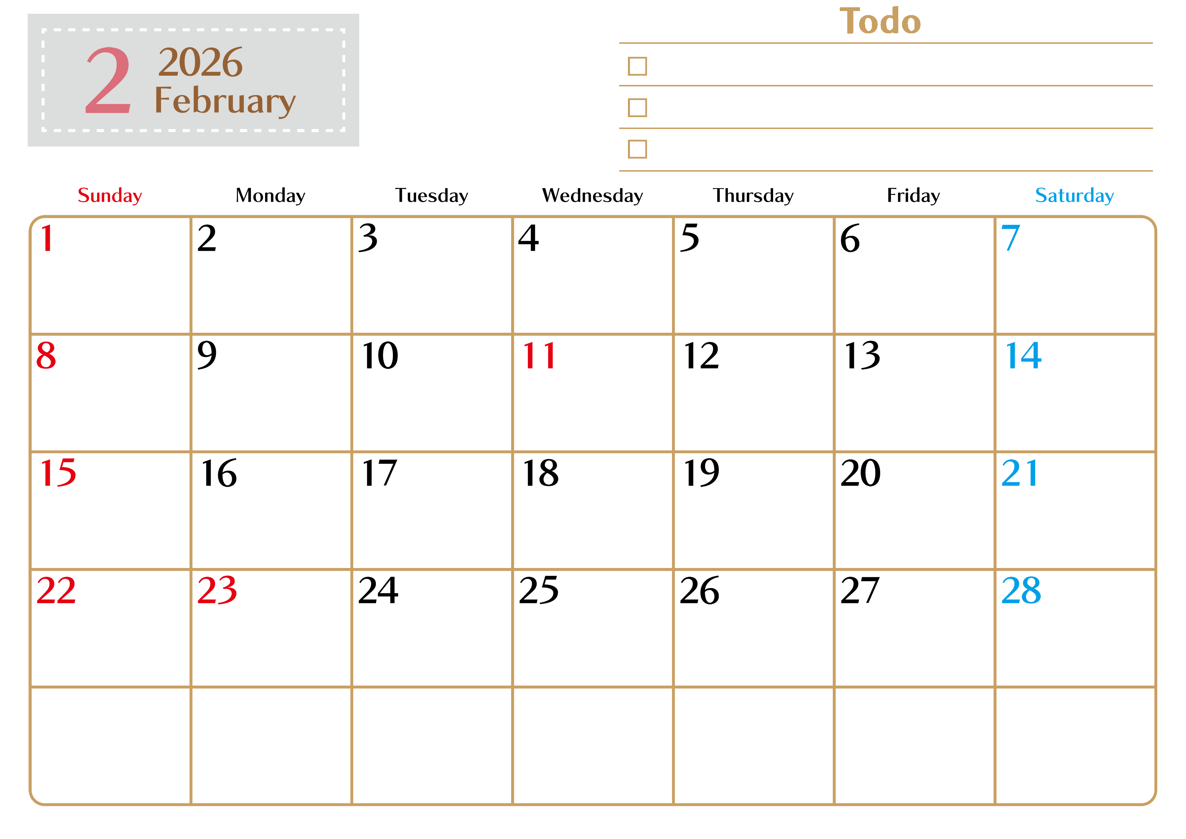 2026年・無料のカレンダーテンプレート 2026年2月カレンダーは横型日曜始まりでToDoリストもあるのでスケジュール計画がしやすい:無料(2026-01460200) 素材状デザイン王 2025年4月12日 2026年2月カレンダーは横型日曜始まりでToDoリストもあるのでスケジュール計画がしやすいです。無料にてダウンロードをして印刷利用しましょう。(2026-01460200) 2月 横型のカレンダー 日曜始まり ToDoリスト カレンダーデザイン-0146