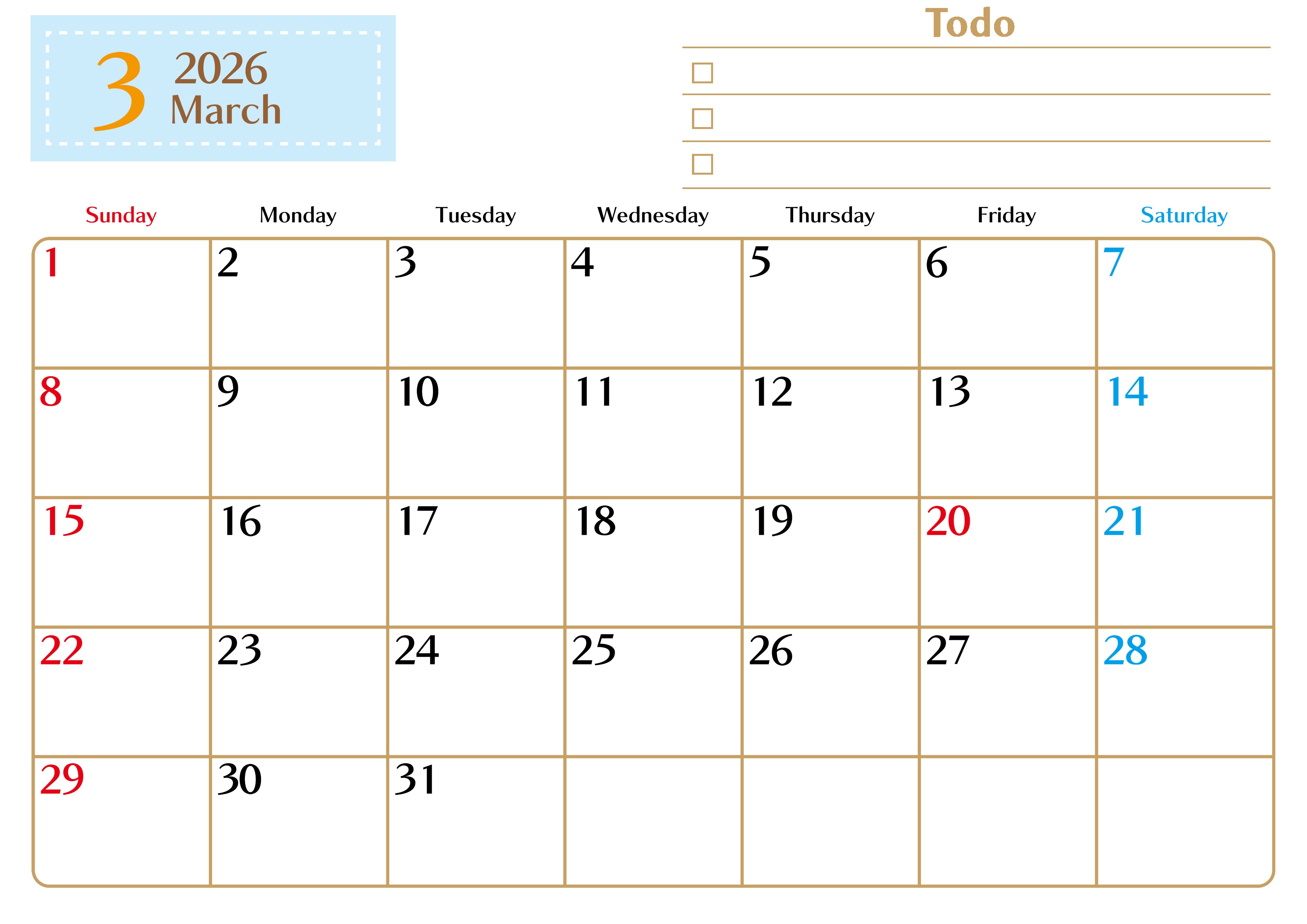 2026年3月カレンダーは横型日曜始まりでToDoリストもあるのでスケジュール計画がしやすいです。無料にてダウンロードをして印刷利用しましょう。(2026-01460300)