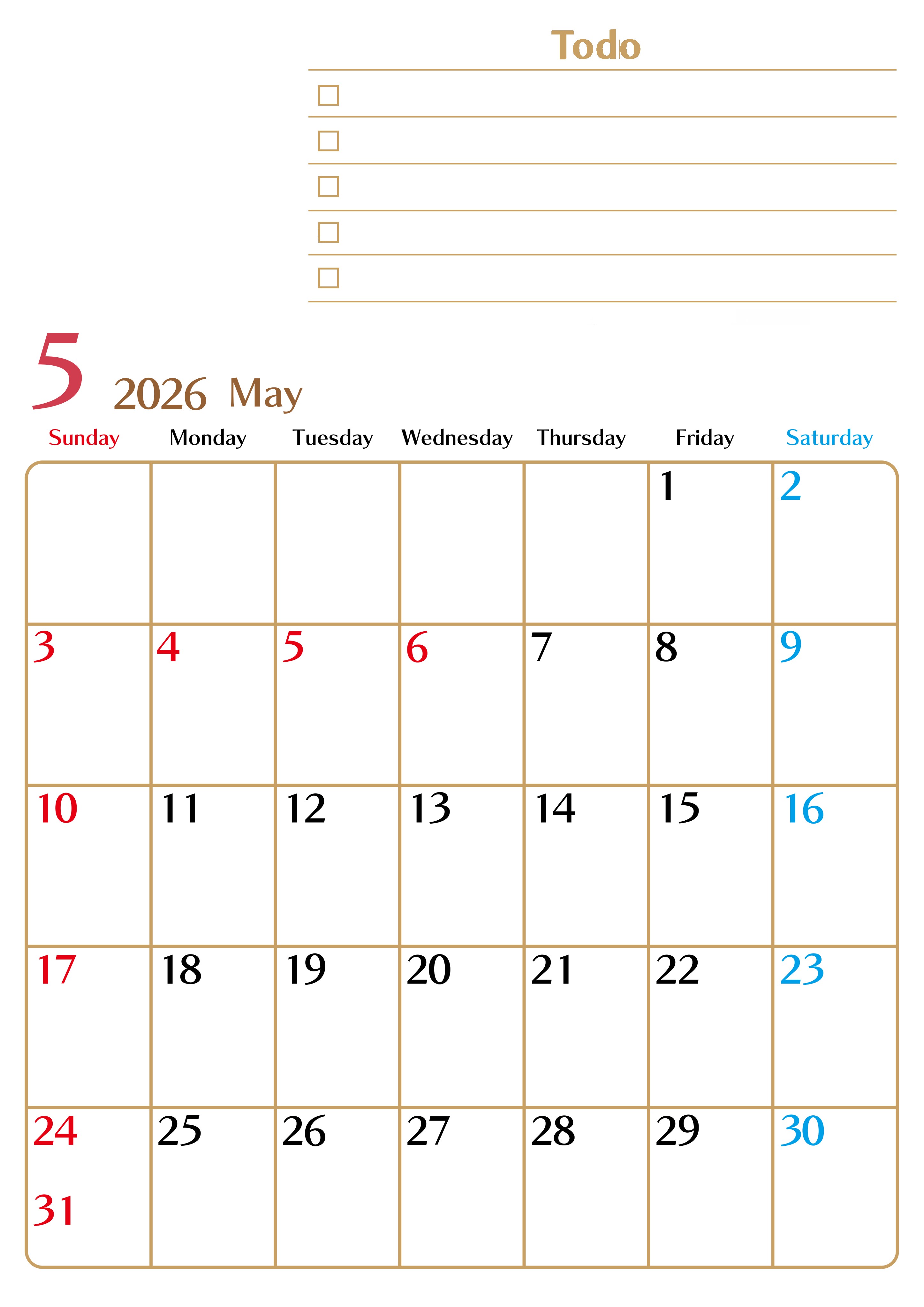 2026年5月カレンダーは縦型日曜始まりでToDoリストもあるのでスケジュール計画がしやすいです。無料にてダウンロードをして印刷利用しましょう。(2026-01460510)