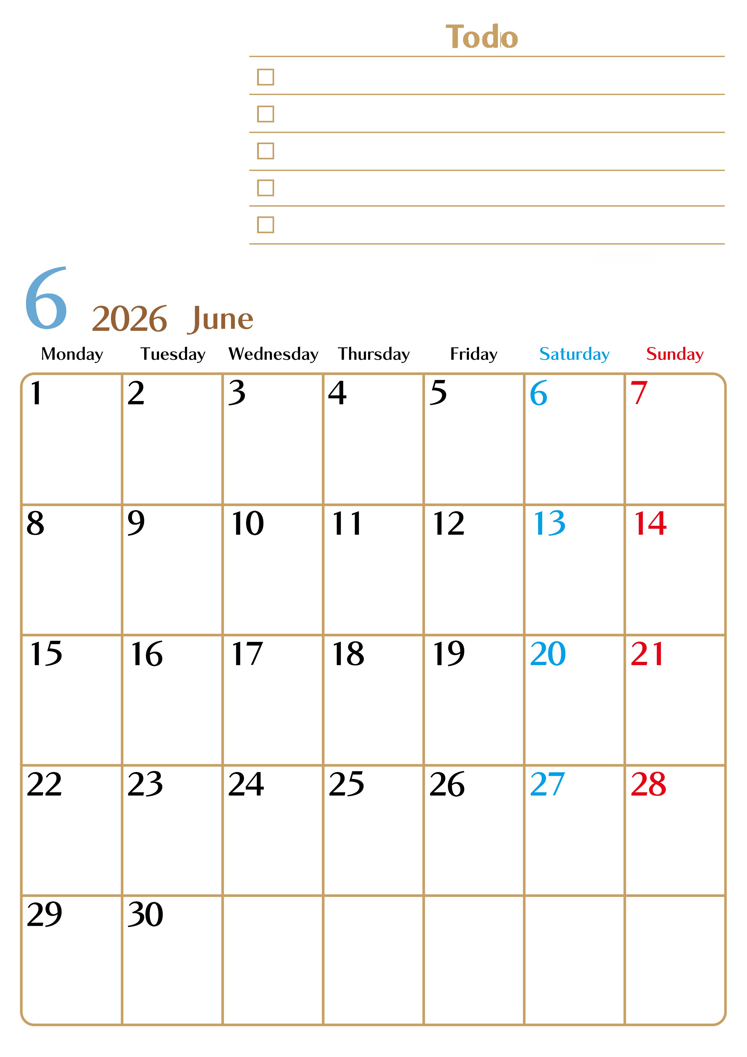 2026年・無料のカレンダーテンプレート 2026年6月カレンダーは縦型月曜始まりでToDoリストもあるのでスケジュール計画がしやすい:無料(2026-01460611) 素材状デザイン王 2025年4月12日 2026年6月カレンダーは縦型月曜始まりでToDoリストもあるのでスケジュール計画がしやすいです。無料にてダウンロードをして印刷利用しましょう。(2026-01460611) 6月 縦型のカレンダー 月曜始まり ToDoリスト カレンダーデザイン-0146