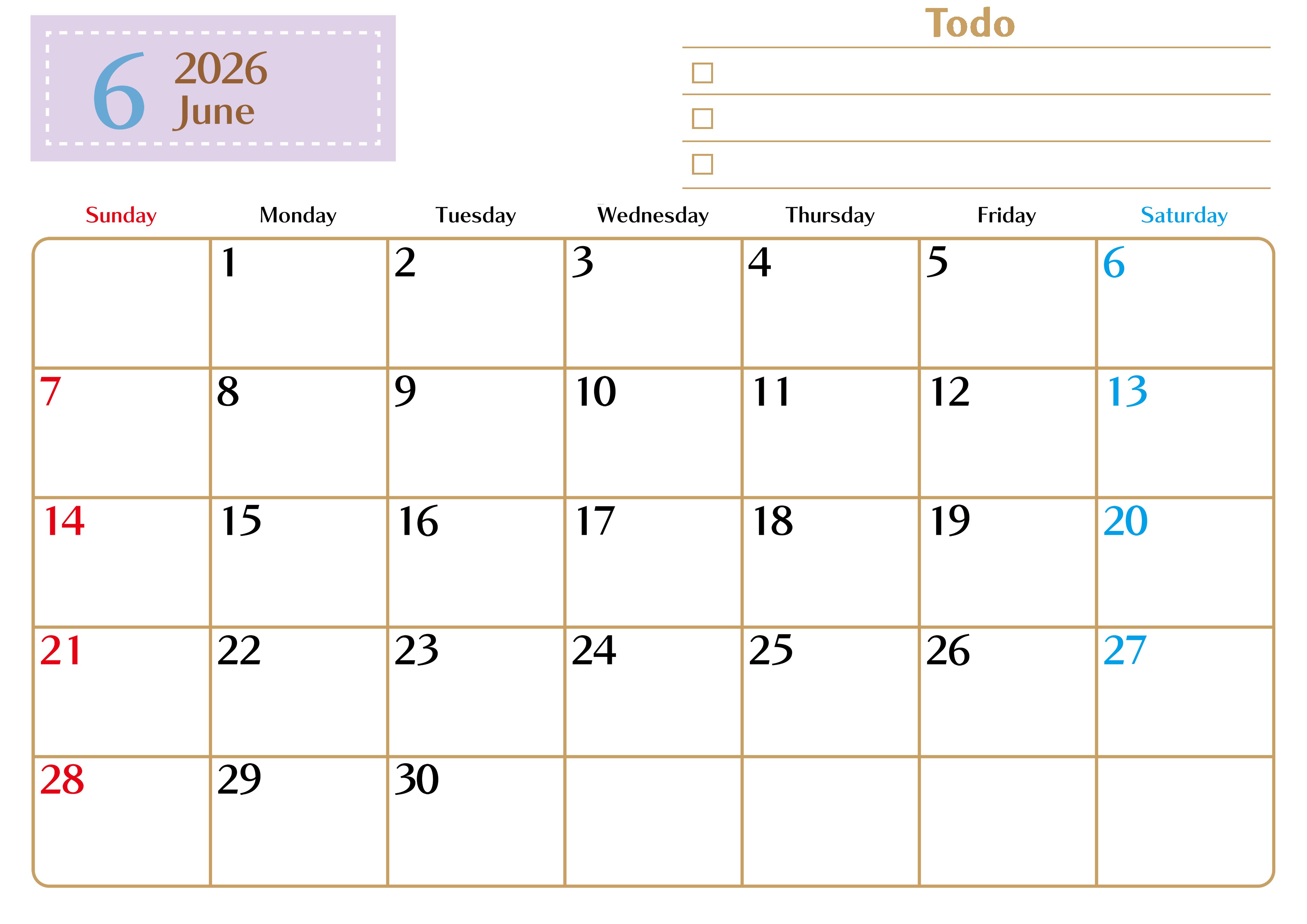 2026年・無料のカレンダーテンプレート 2026年6月カレンダーは横型日曜始まりでToDoリストもあるのでスケジュール計画がしやすい:無料(2026-01460600) 素材状デザイン王 2025年4月12日 2026年6月カレンダーは横型日曜始まりでToDoリストもあるのでスケジュール計画がしやすいです。無料にてダウンロードをして印刷利用しましょう。(2026-01460600) 6月 横型のカレンダー 日曜始まり ToDoリスト カレンダーデザイン-0146