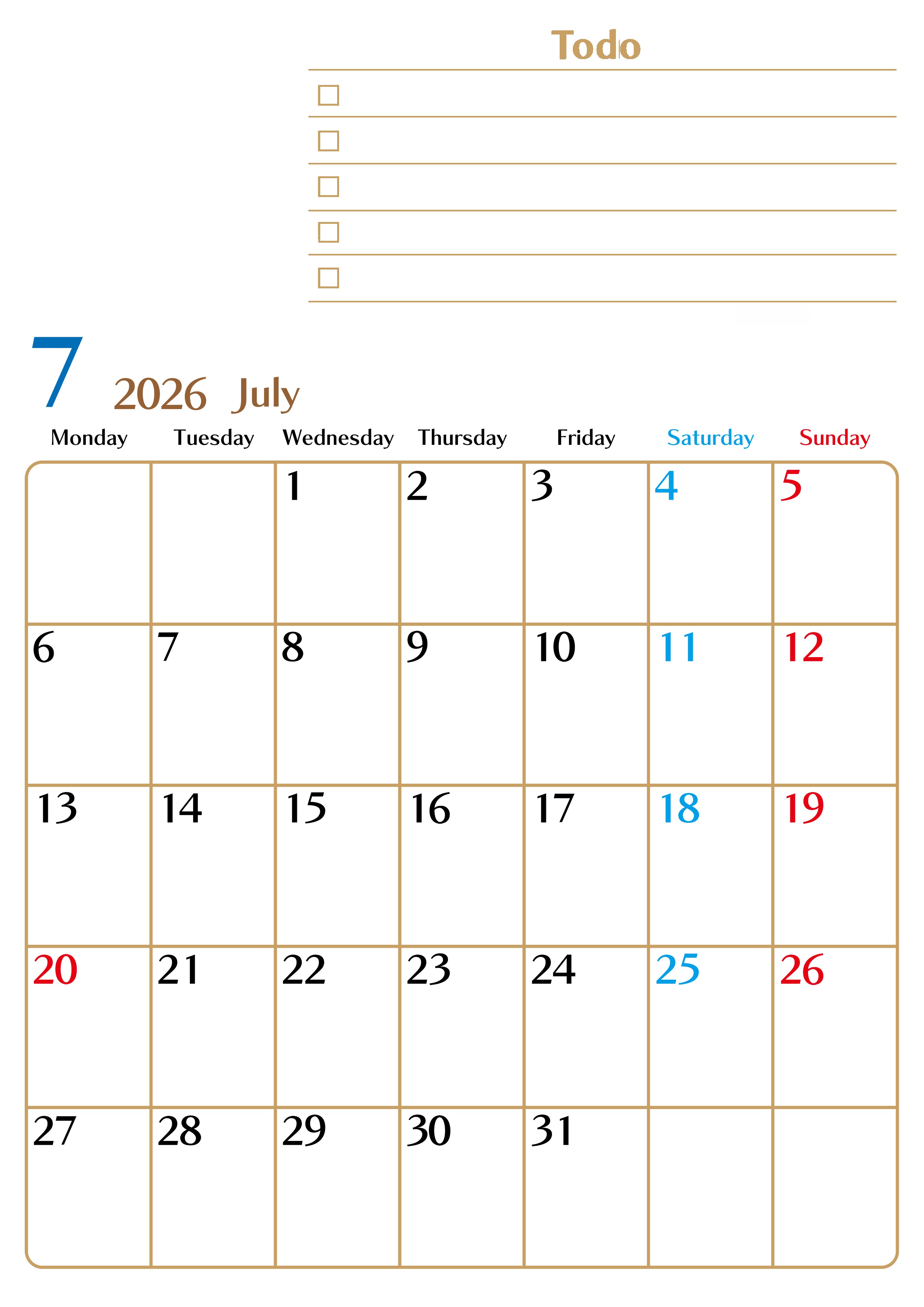 2026年7月カレンダーは縦型月曜始まりでToDoリストもあるのでスケジュール計画がしやすいです。無料にてダウンロードをして印刷利用しましょう。(2026-01460711)