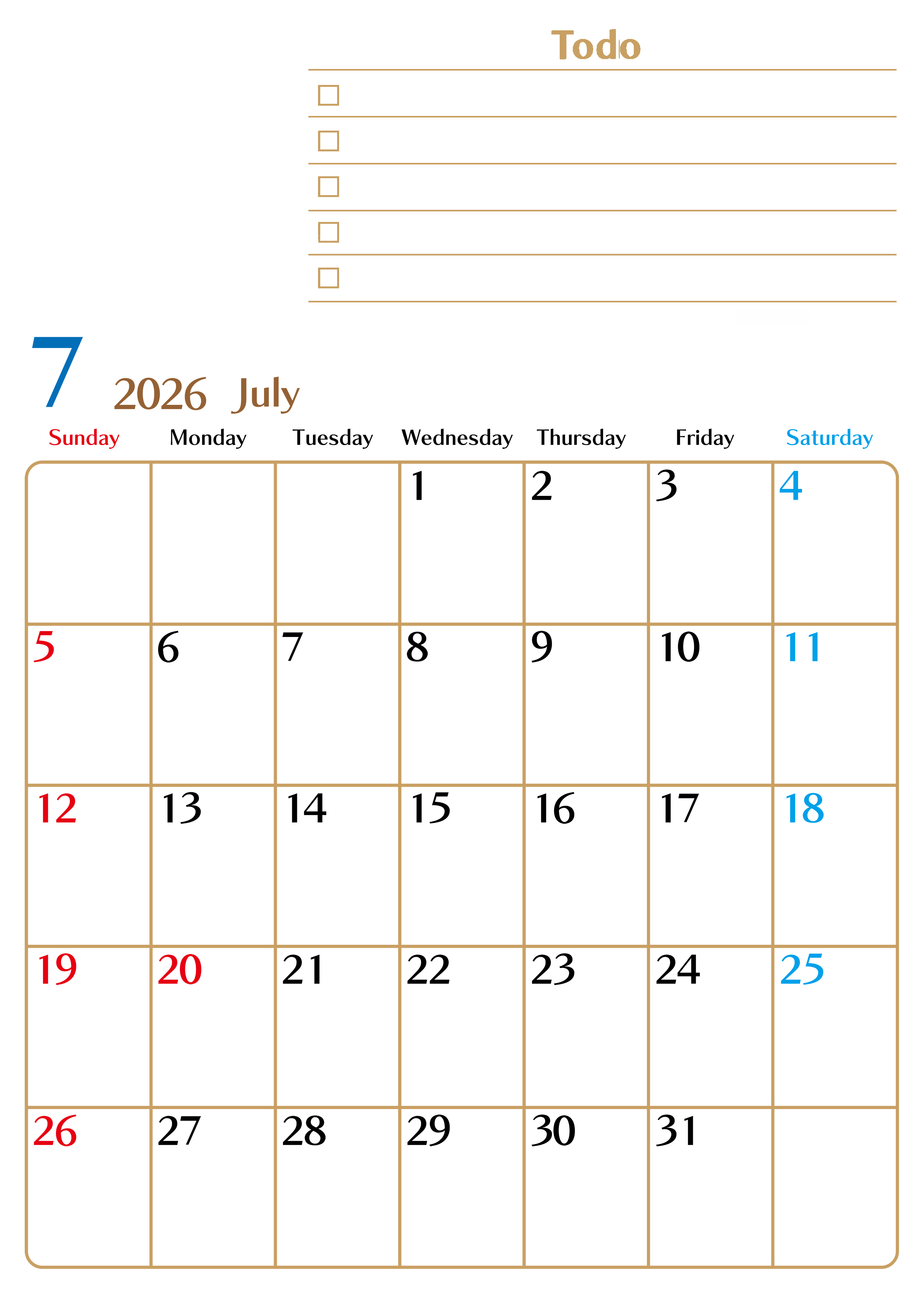 2026年・無料のカレンダーテンプレート 2026年7月カレンダーは縦型日曜始まり でベージュの花がおしゃれ:無料(2026-01460710) 素材状デザイン王 2025年4月12日 2026年7月カレンダーは縦型日曜始まりでToDoリストもあるのでスケジュール計画がしやすいです。無料にてダウンロードをして印刷利用しましょう。(2026-01460710) 7月 縦型のカレンダー 日曜始まり ToDoリスト カレンダーデザイン-0146