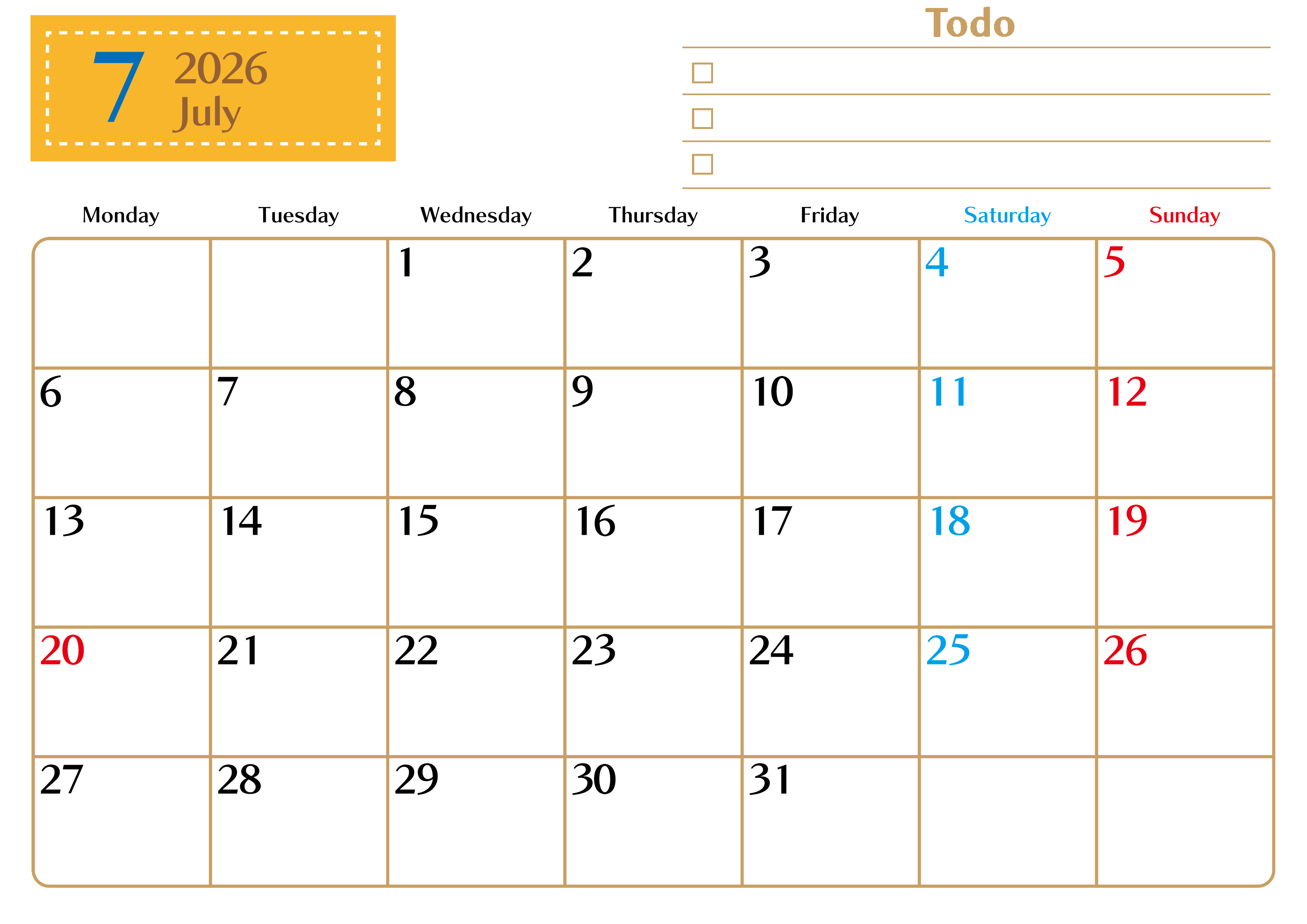 2026年7月カレンダーは横型月曜始まりでToDoリストもあるのでスケジュール計画がしやすいです。無料にてダウンロードをして印刷利用しましょう。(2026-01460701)