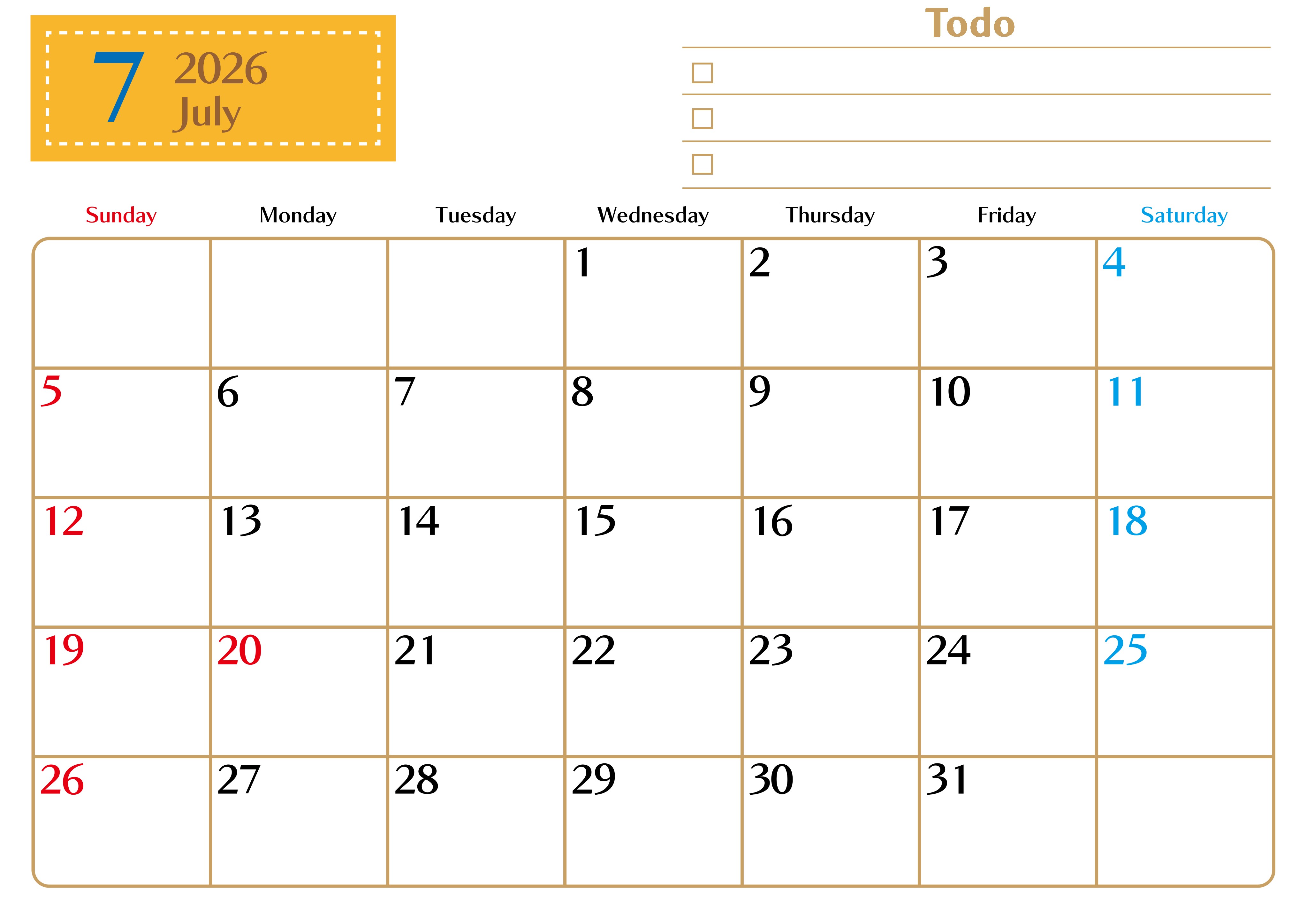 2026年7月カレンダーは横型日曜始まりでToDoリストもあるのでスケジュール計画がしやすいです。無料にてダウンロードをして印刷利用しましょう。(2026-01460700)