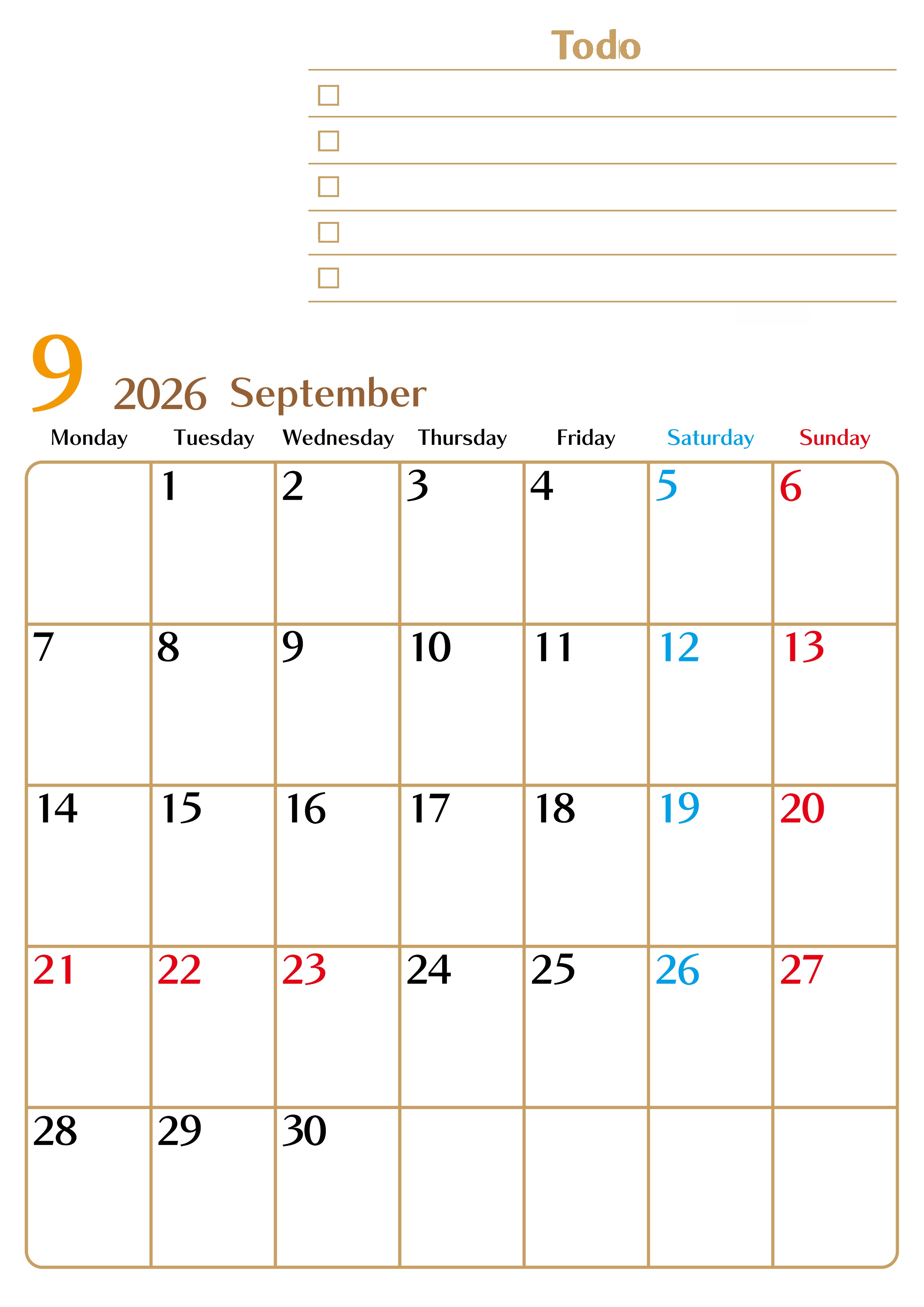 2026年9月カレンダーは縦型月曜始まりでToDoリストもあるのでスケジュール計画がしやすいです。無料にてダウンロードをして印刷利用しましょう。(2026-01460911)