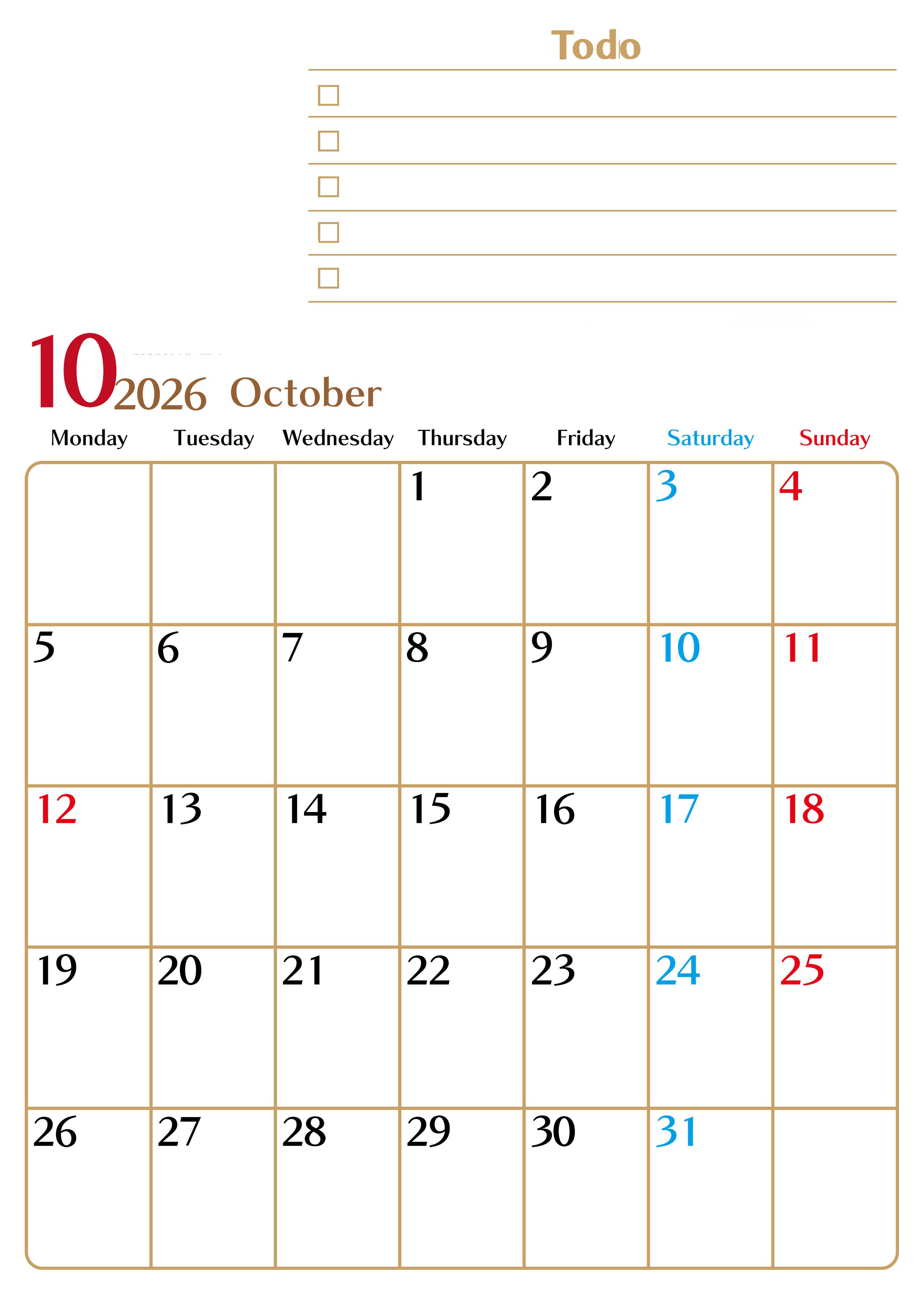 2026年・無料のカレンダーテンプレート 2026年10月カレンダーは縦型月曜始まりでToDoリストもあるのでスケジュール計画がしやすい:無料(2026-01461011) 素材状デザイン王 2025年4月12日 2026年10月カレンダーは縦型月曜始まりでToDoリストもあるのでスケジュール計画がしやすいです。無料にてダウンロードをして印刷利用しましょう。(2026-01461011) 10月 縦型のカレンダー 月曜始まり ToDoリスト カレンダーデザイン-0146