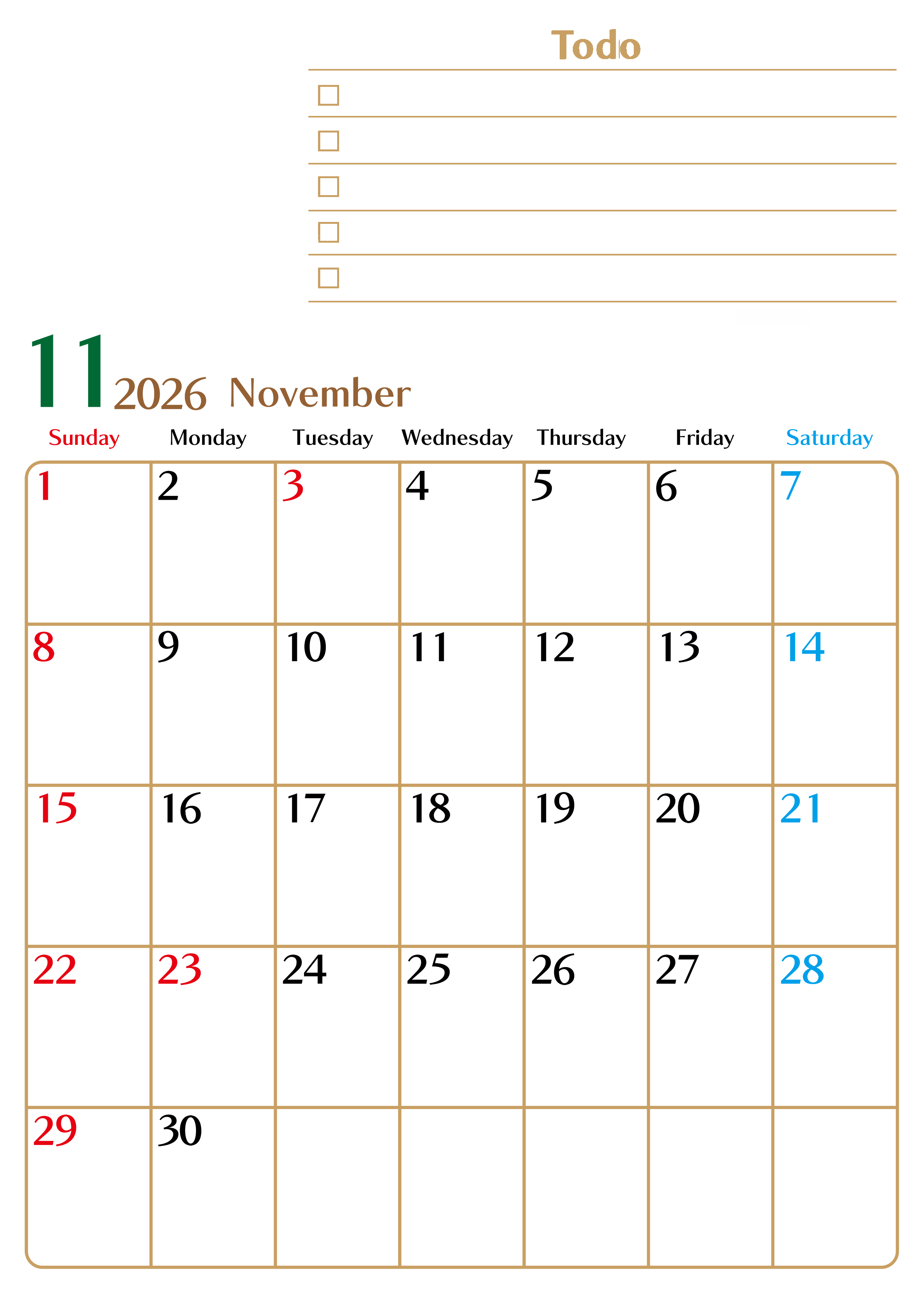 2026年11月カレンダーは縦型日曜始まりでToDoリストもあるのでスケジュール計画がしやすいです。無料にてダウンロードをして印刷利用しましょう。(2026-01461110)