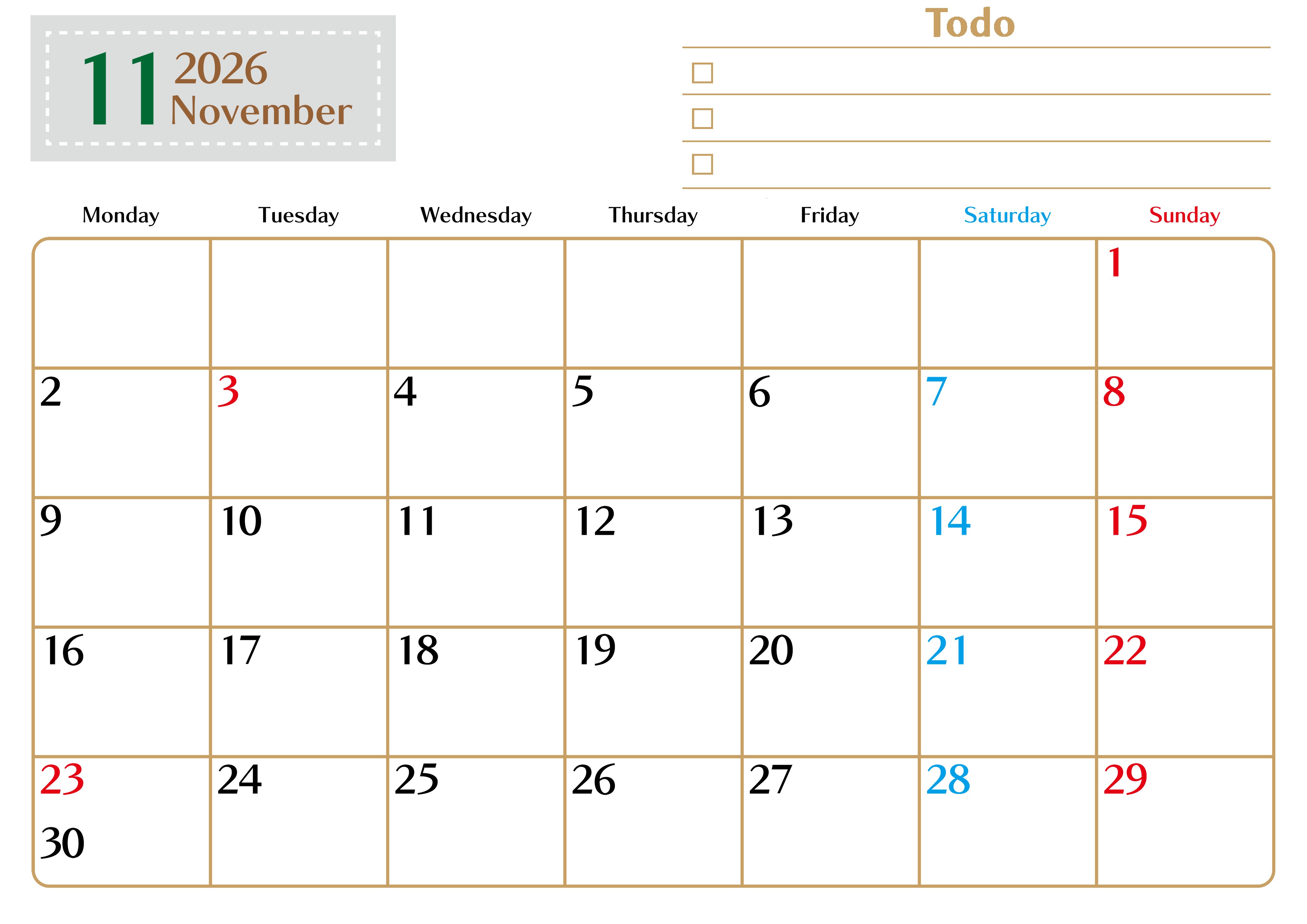 2026年・無料のカレンダーテンプレート 2026年11月カレンダーは横型月曜始まりでToDoリストもあるのでスケジュール計画がしやすい:無料(2026-01461101) 素材状デザイン王 2025年4月12日 2026年11月カレンダーは横型月曜始まりでToDoリストもあるのでスケジュール計画がしやすいです。無料にてダウンロードをして印刷利用しましょう。(2026-01461101) 11月 横型のカレンダー 月曜始まり ToDoリスト カレンダーデザイン-0146