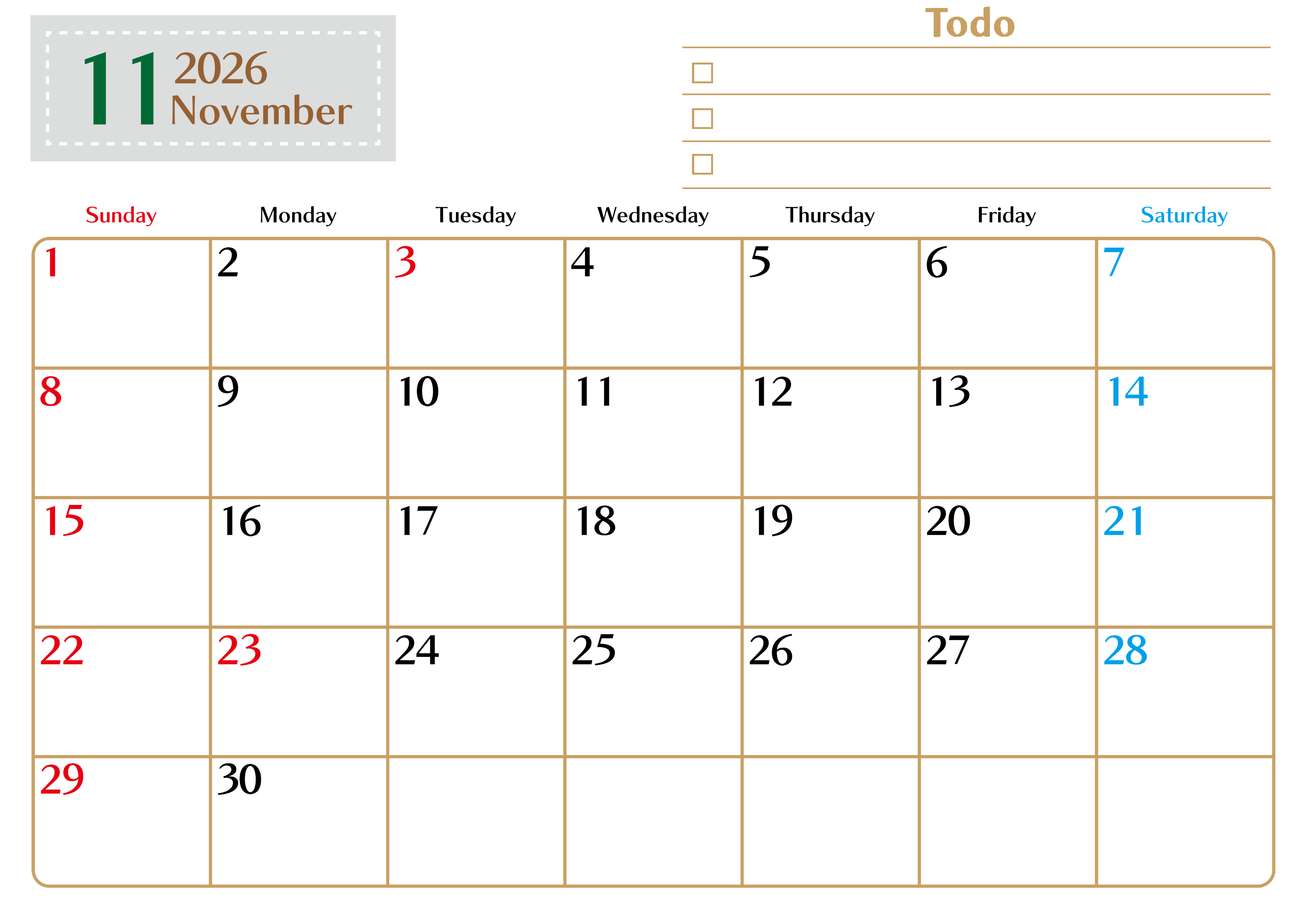 2026年・無料のカレンダーテンプレート 2026年11月カレンダーは横型日曜始まりでToDoリストもあるのでスケジュール計画がしやすい:無料(2026-01461100) 素材状デザイン王 2025年4月12日 2026年11月カレンダーは横型日曜始まりでToDoリストもあるのでスケジュール計画がしやすいです。無料にてダウンロードをして印刷利用しましょう。(2026-01461100) 11月 横型のカレンダー 日曜始まり ToDoリスト カレンダーデザイン-0146