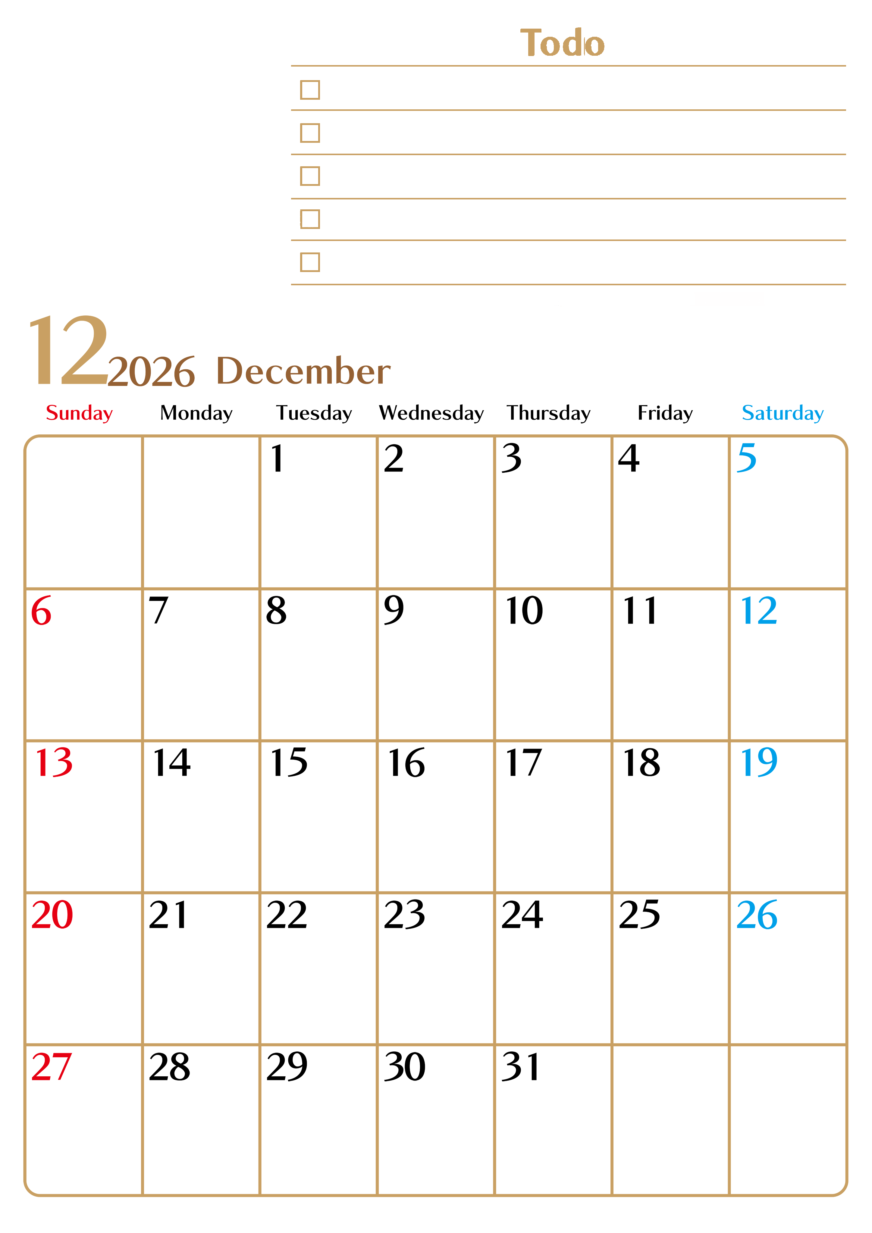 2026年12月カレンダーは縦型日曜始まりでToDoリストもあるのでスケジュール計画がしやすいです。無料にてダウンロードをして印刷利用しましょう。(2026-01461210)