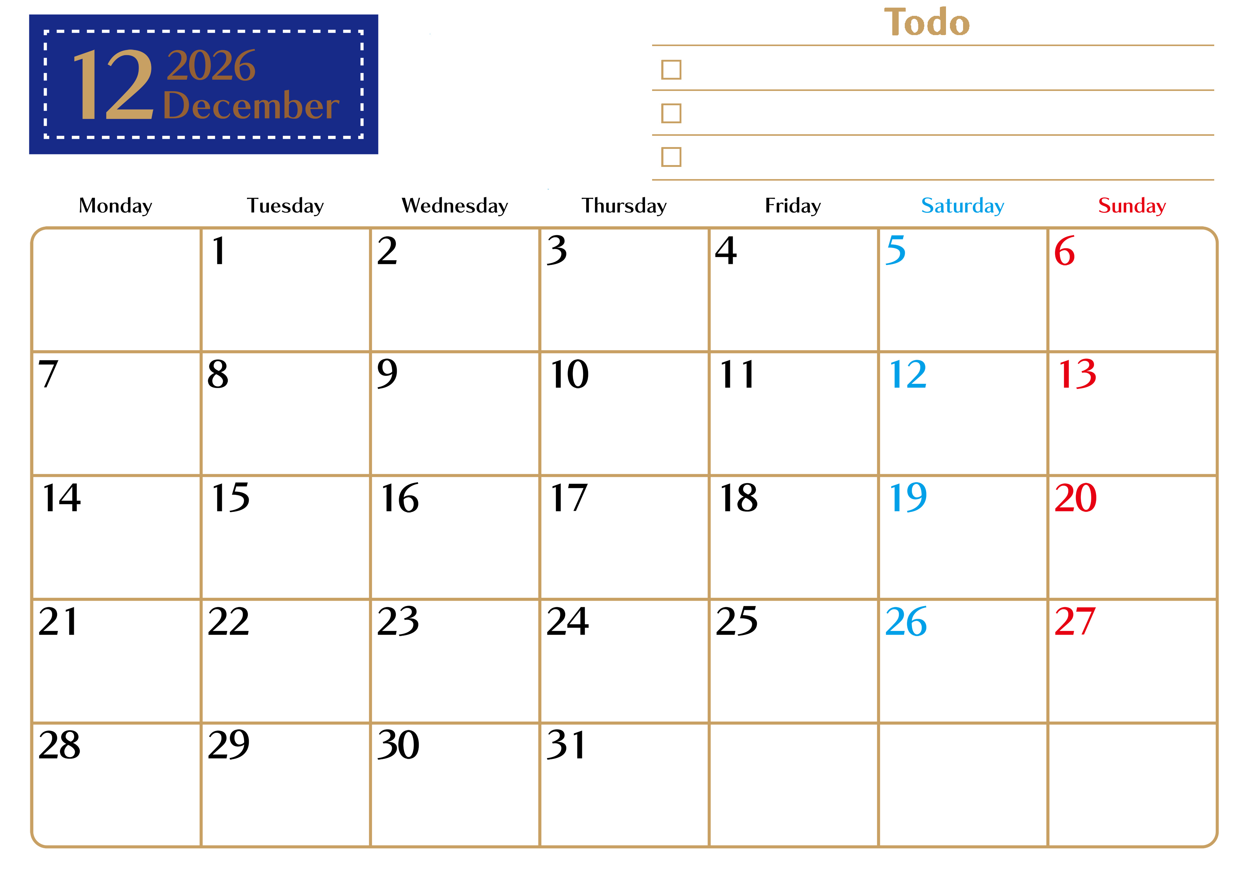 2026年・無料のカレンダーテンプレート 2026年12月カレンダーは横型月曜始まりでToDoリストもあるのでスケジュール計画がしやすい:無料(2026-01461201) 素材状デザイン王 2025年4月12日 2026年12月カレンダーは横型月曜始まりでToDoリストもあるのでスケジュール計画がしやすいです。無料にてダウンロードをして印刷利用しましょう。(2026-01461201) 12月 横型のカレンダー 月曜始まり ToDoリスト カレンダーデザイン-0146