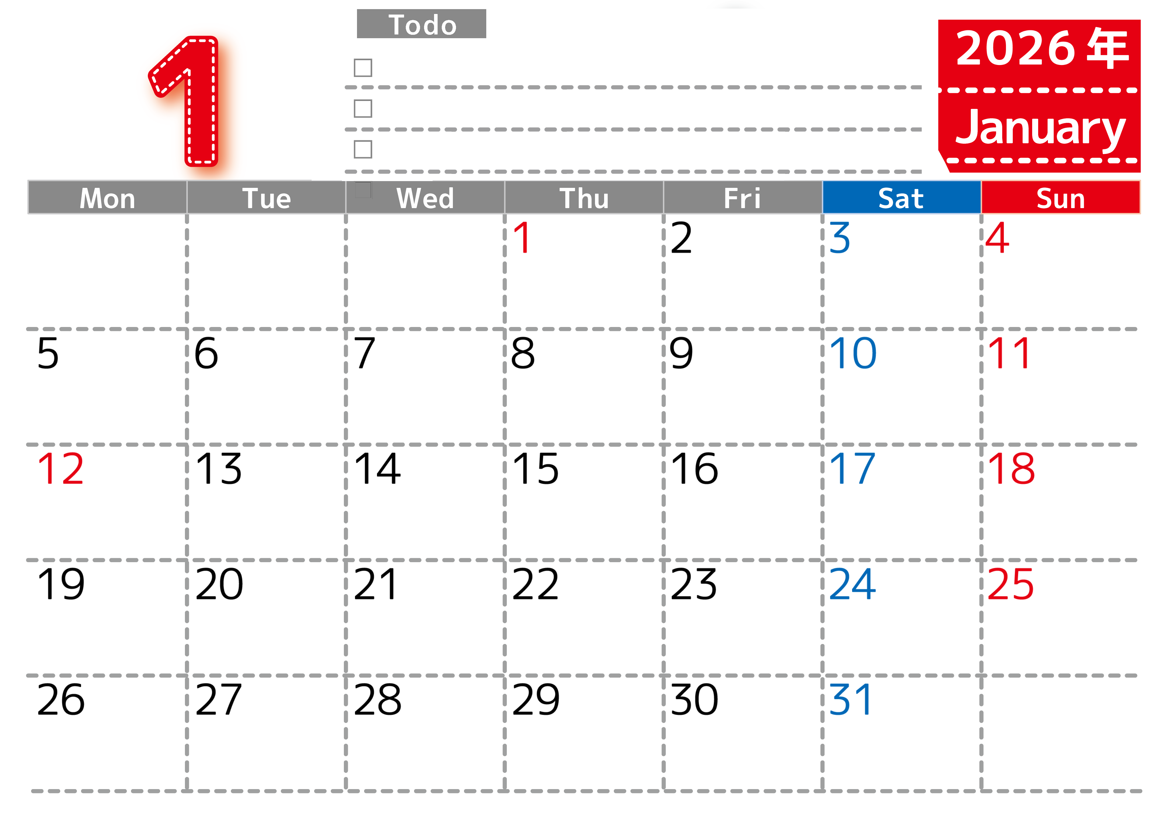 2026年・無料のカレンダーテンプレート 2026年1月カレンダーは横型月曜始まり♪使い方がシンプルなToDoリストも♪ダウンロード無料(2026-01470101) 素材状デザイン王 2025年4月12日 2026年1月カレンダーは横型月曜始まりです。使い方がシンプルなToDoリストも魅力的です。ダウンロードは無料で簡単です。(2026-01470101) 1月 横型のカレンダー 月曜始まり ToDoリスト カレンダーデザイン-0147