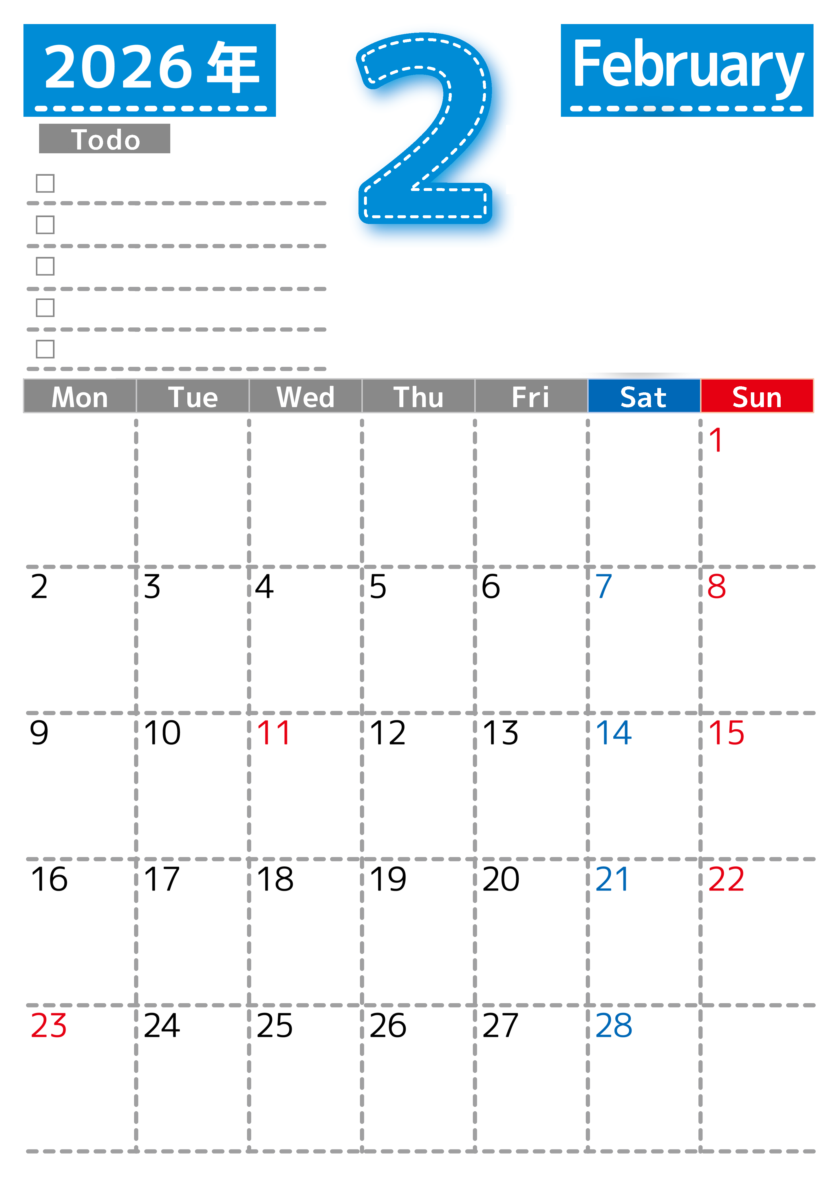 2026年・無料のカレンダーテンプレート 2026年2月カレンダーは縦型月曜始まり♪使い方がシンプルなToDoリストも♪ダウンロード無料(2026-01470211) 素材状デザイン王 2025年4月12日 2026年2月カレンダーは縦型月曜始まりです。使い方がシンプルなToDoリストも魅力的です。ダウンロードは無料で簡単です。(2026-01470211) 2月 縦型のカレンダー 月曜始まり ToDoリスト カレンダーデザイン-0147