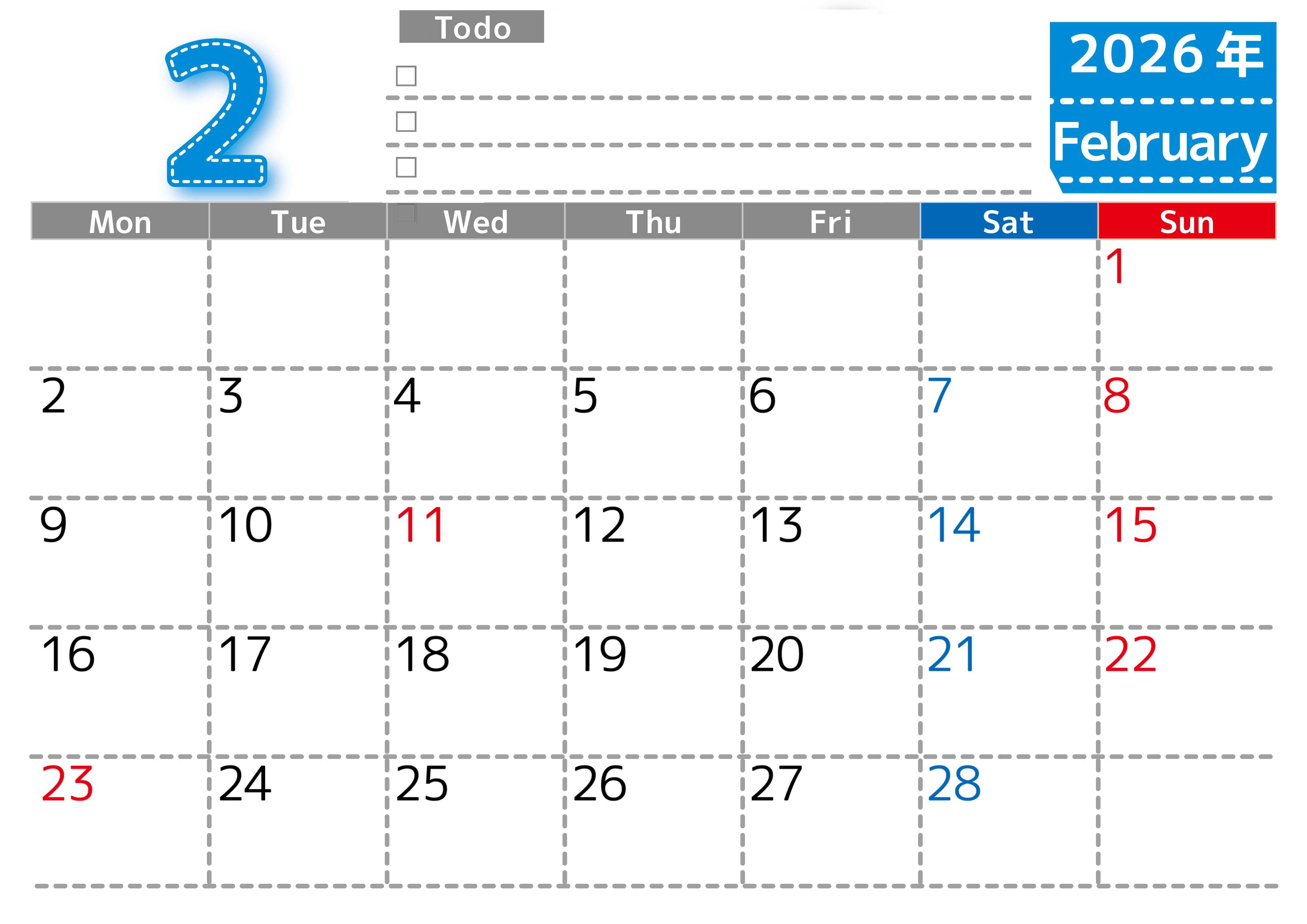 2026年2月カレンダーは横型月曜始まりです。使い方がシンプルなToDoリストも魅力的です。ダウンロードは無料で簡単です。(2026-01470201)