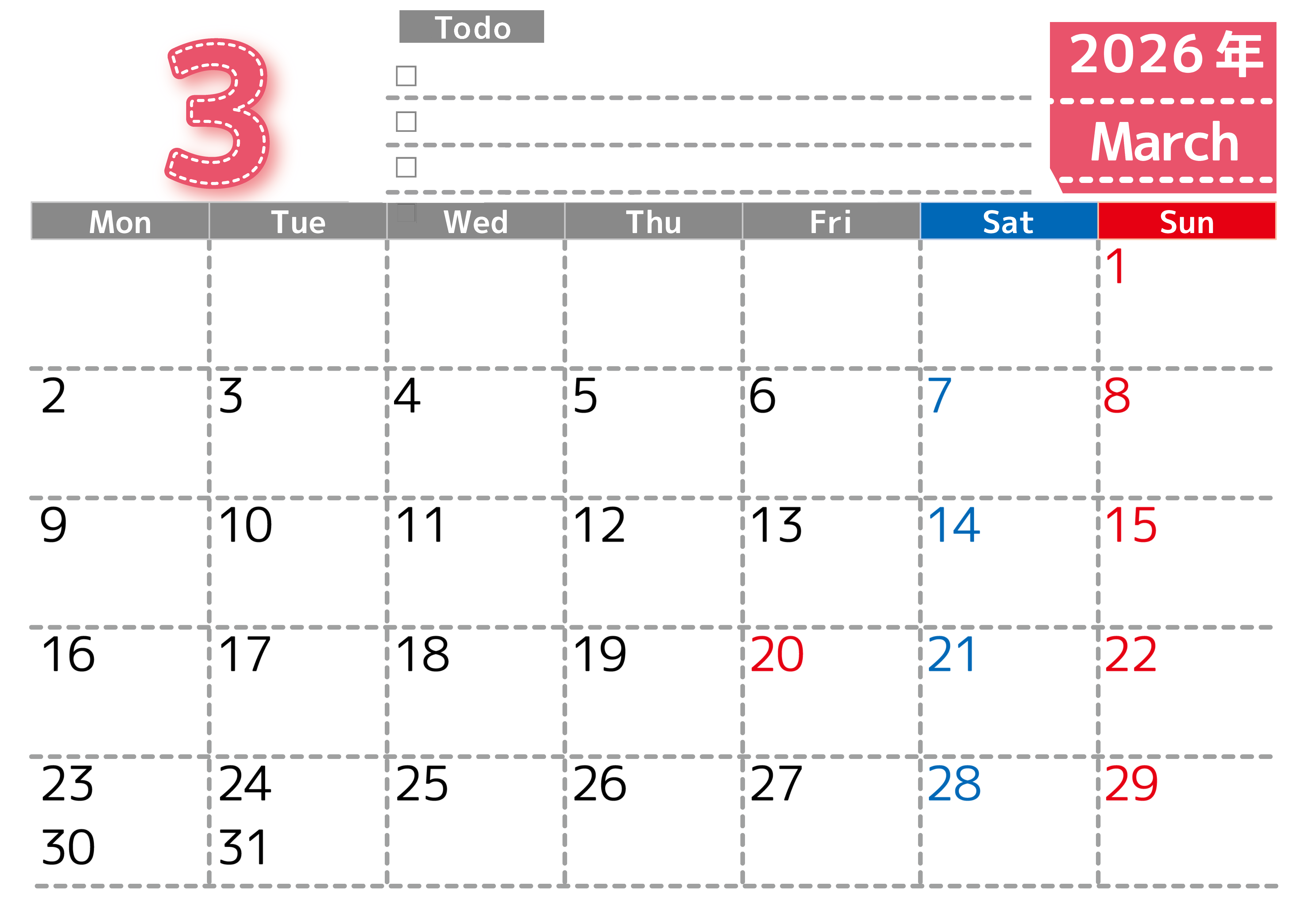 2026年・無料のカレンダーテンプレート 2026年3月カレンダーは横型月曜始まり♪使い方がシンプルなToDoリストも♪ダウンロード無料(2026-01470301) 素材状デザイン王 2025年4月12日 2026年3月カレンダーは横型月曜始まりです。使い方がシンプルなToDoリストも魅力的です。ダウンロードは無料で簡単です。(2026-01470301) 3月 横型のカレンダー 月曜始まり ToDoリスト カレンダーデザイン-0147