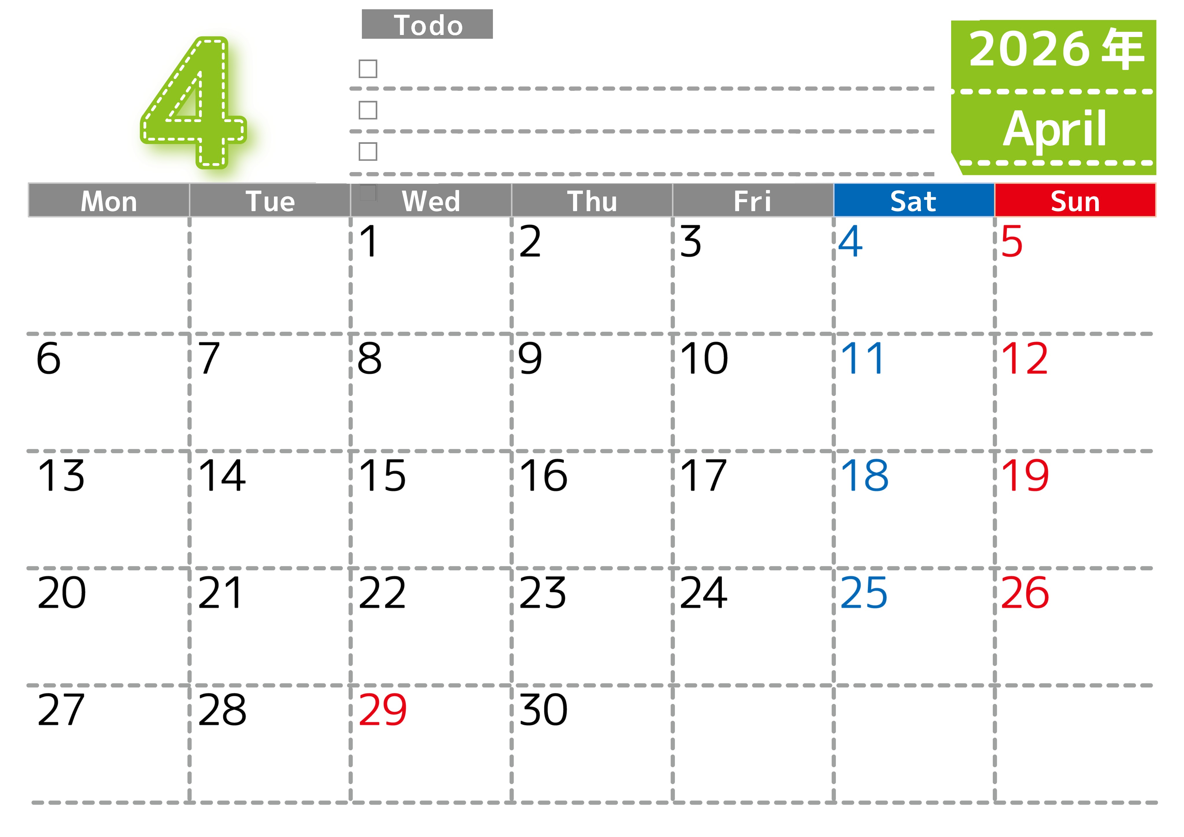 2026年4月カレンダーは横型月曜始まりです。使い方がシンプルなToDoリストも魅力的です。ダウンロードは無料で簡単です。(2026-01470401)