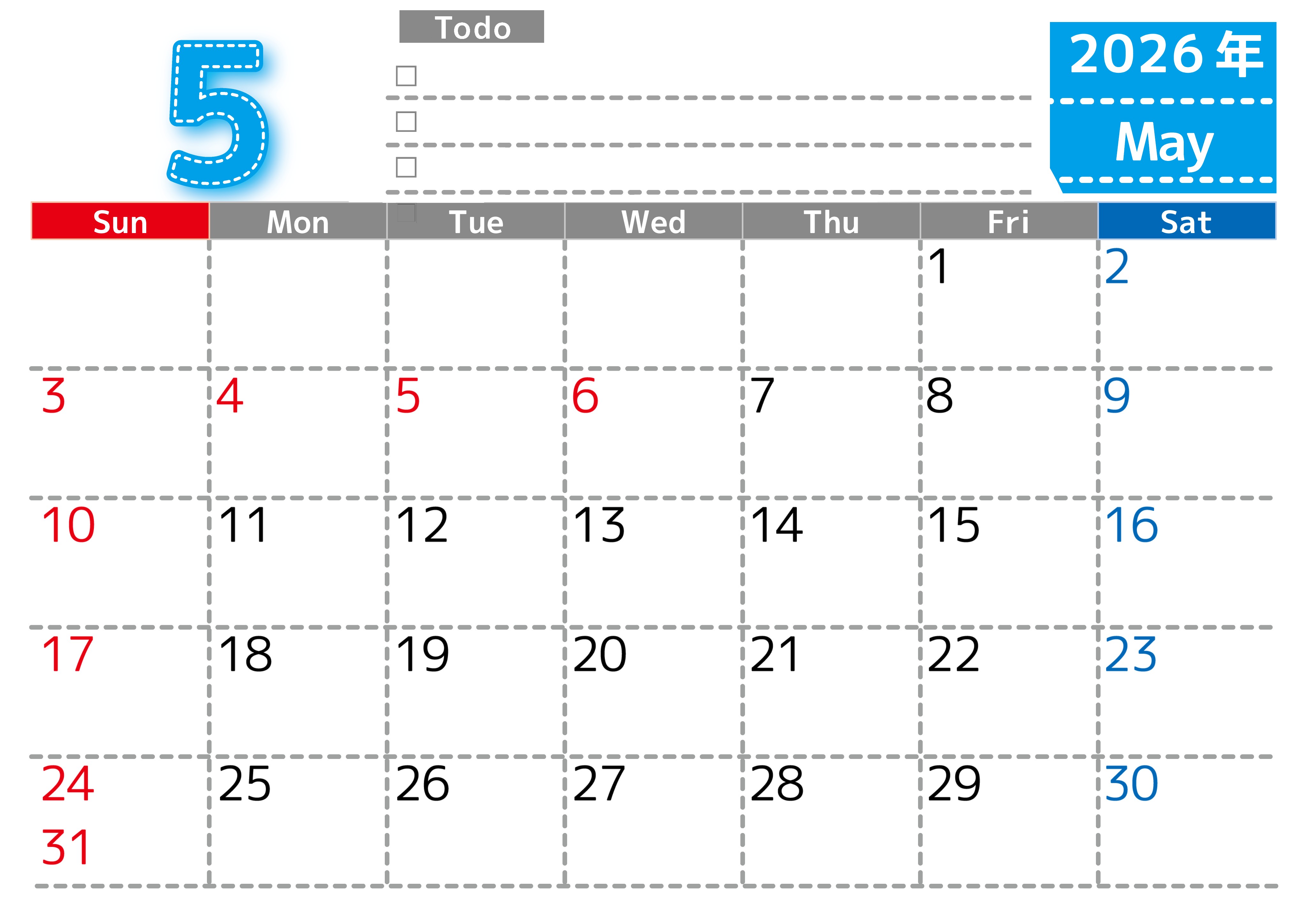2026年5月カレンダーは横型日曜始まりです。使い方がシンプルなToDoリストも魅力的です。ダウンロードは無料で簡単です。(2026-01470500)