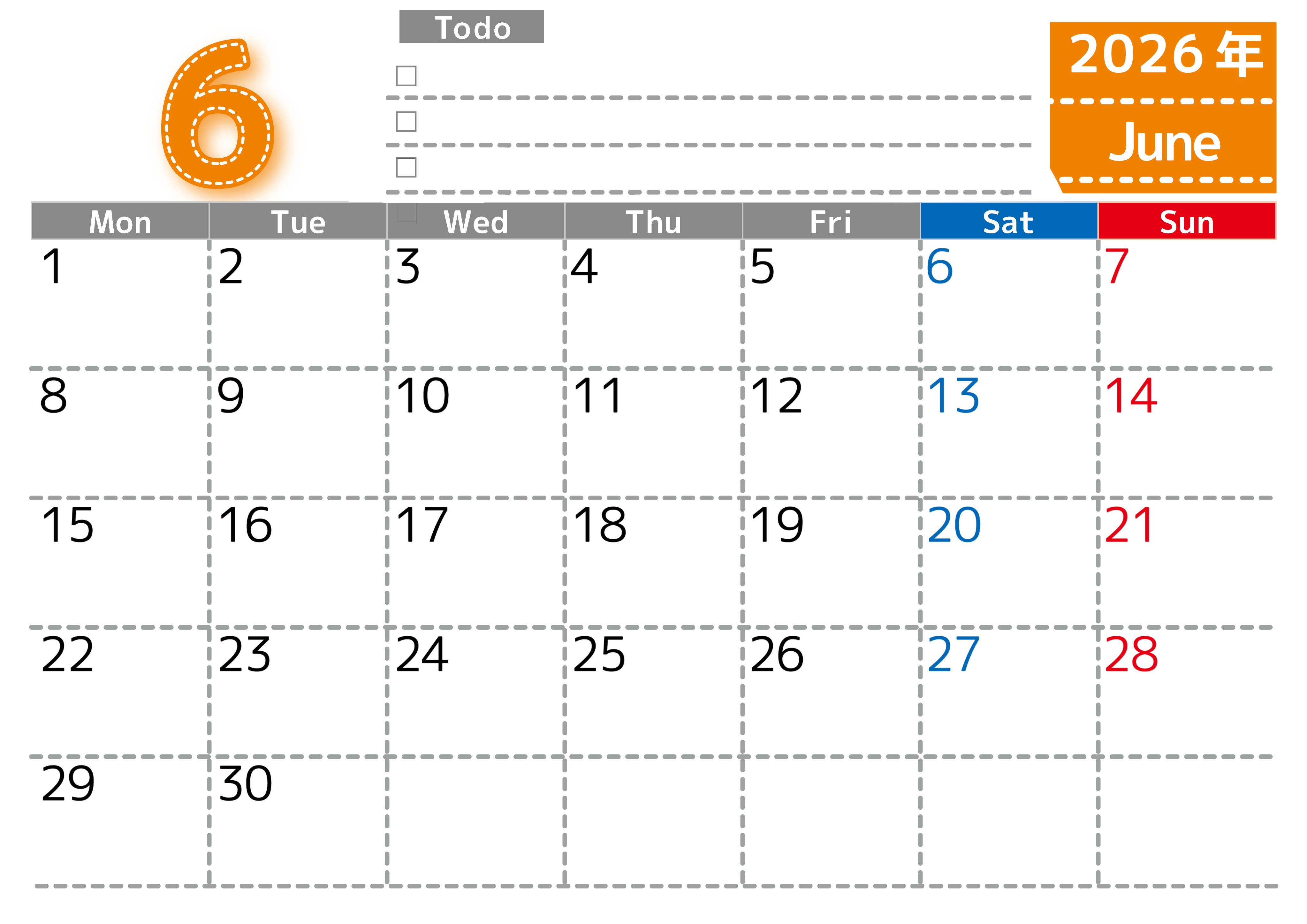 2026年6月カレンダーは横型月曜始まりです。使い方がシンプルなToDoリストも魅力的です。ダウンロードは無料で簡単です。(2026-01470601)
