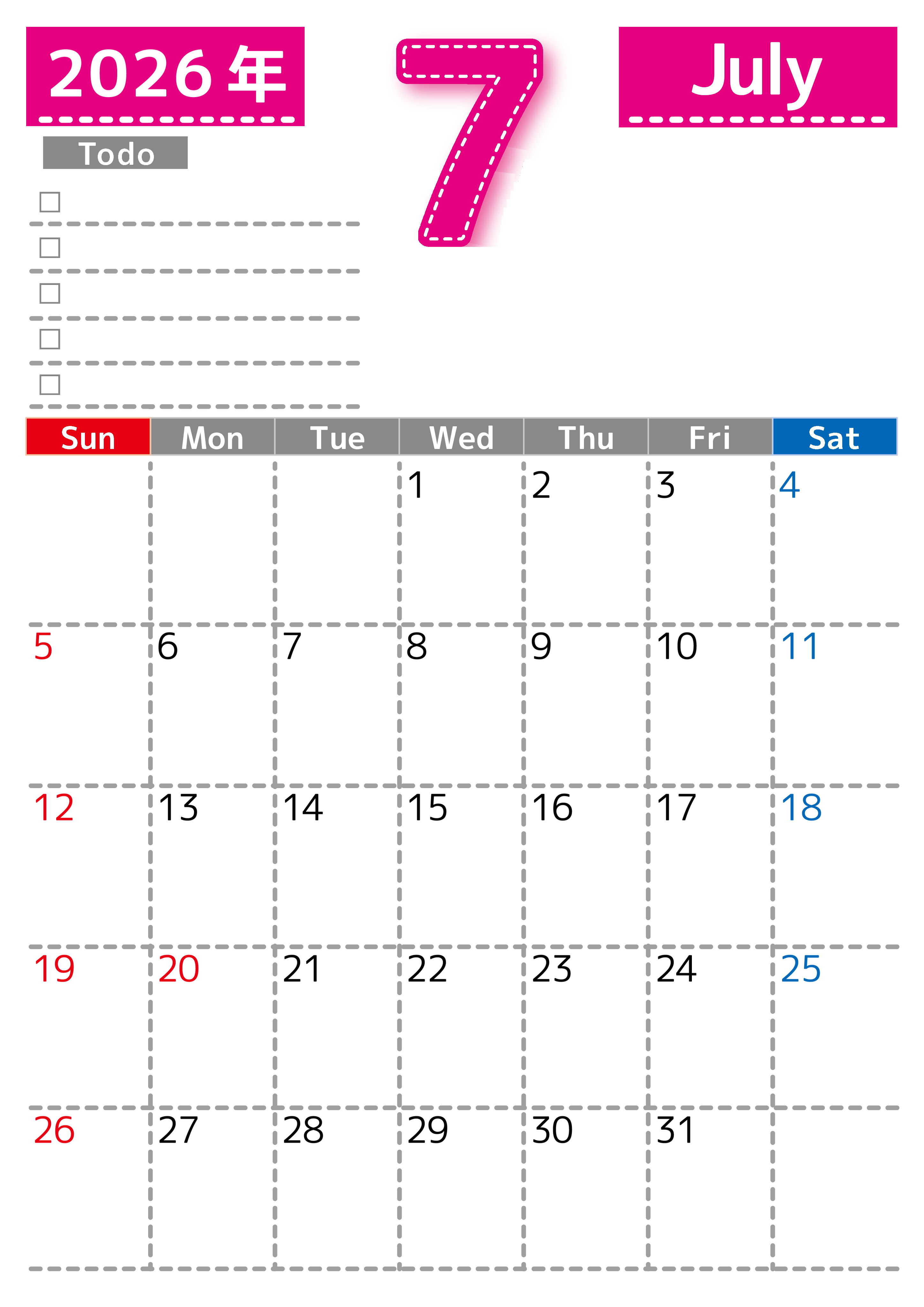 2026年7月カレンダーは縦型日曜始まりです。使い方がシンプルなToDoリストも魅力的です。ダウンロードは無料で簡単です。(2026-01470710)