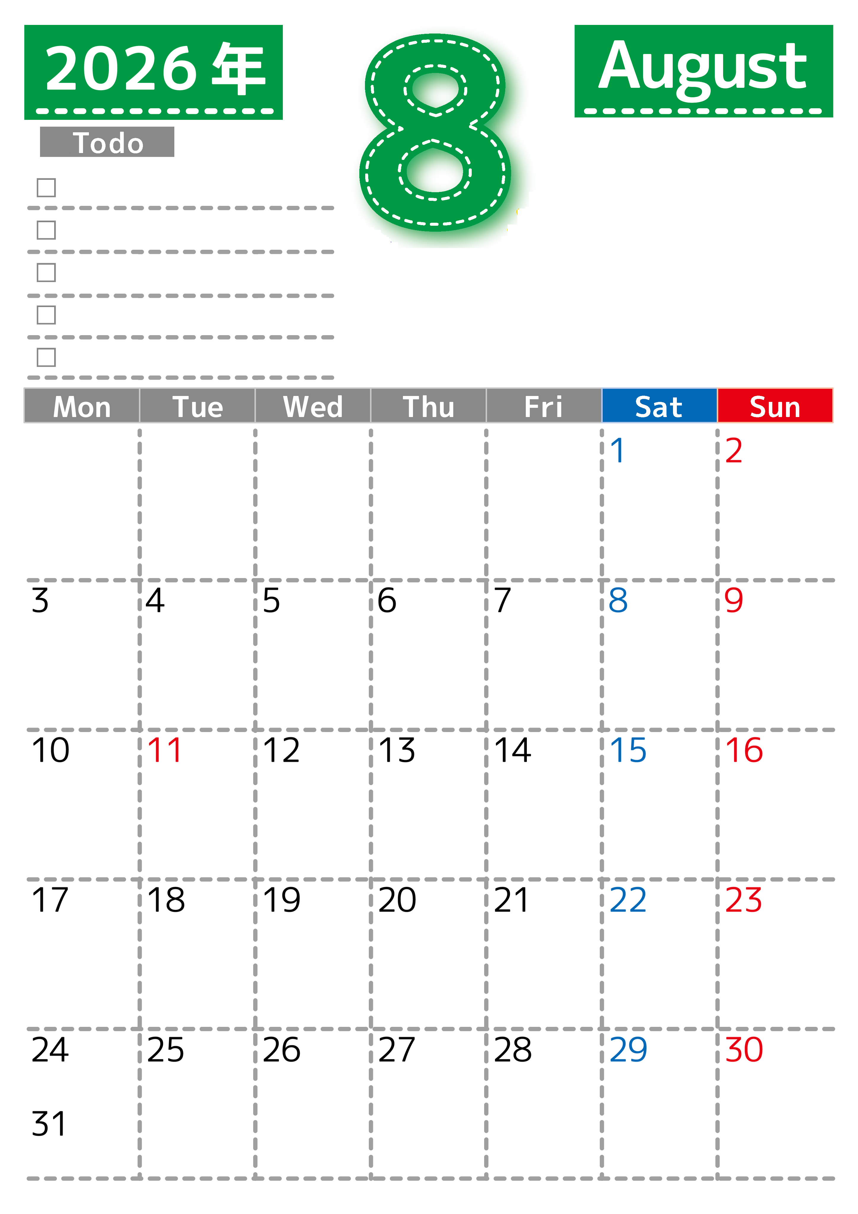 2026年・無料のカレンダーテンプレート 2026年8月カレンダーは縦型月曜始まり♪使い方がシンプルなToDoリストも♪ダウンロード無料(2026-01470811) 素材状デザイン王 2025年4月12日 2026年8月カレンダーは縦型月曜始まりです。使い方がシンプルなToDoリストも魅力的です。ダウンロードは無料で簡単です。(2026-01470811) 8月 縦型のカレンダー 月曜始まり ToDoリスト カレンダーデザイン-0147