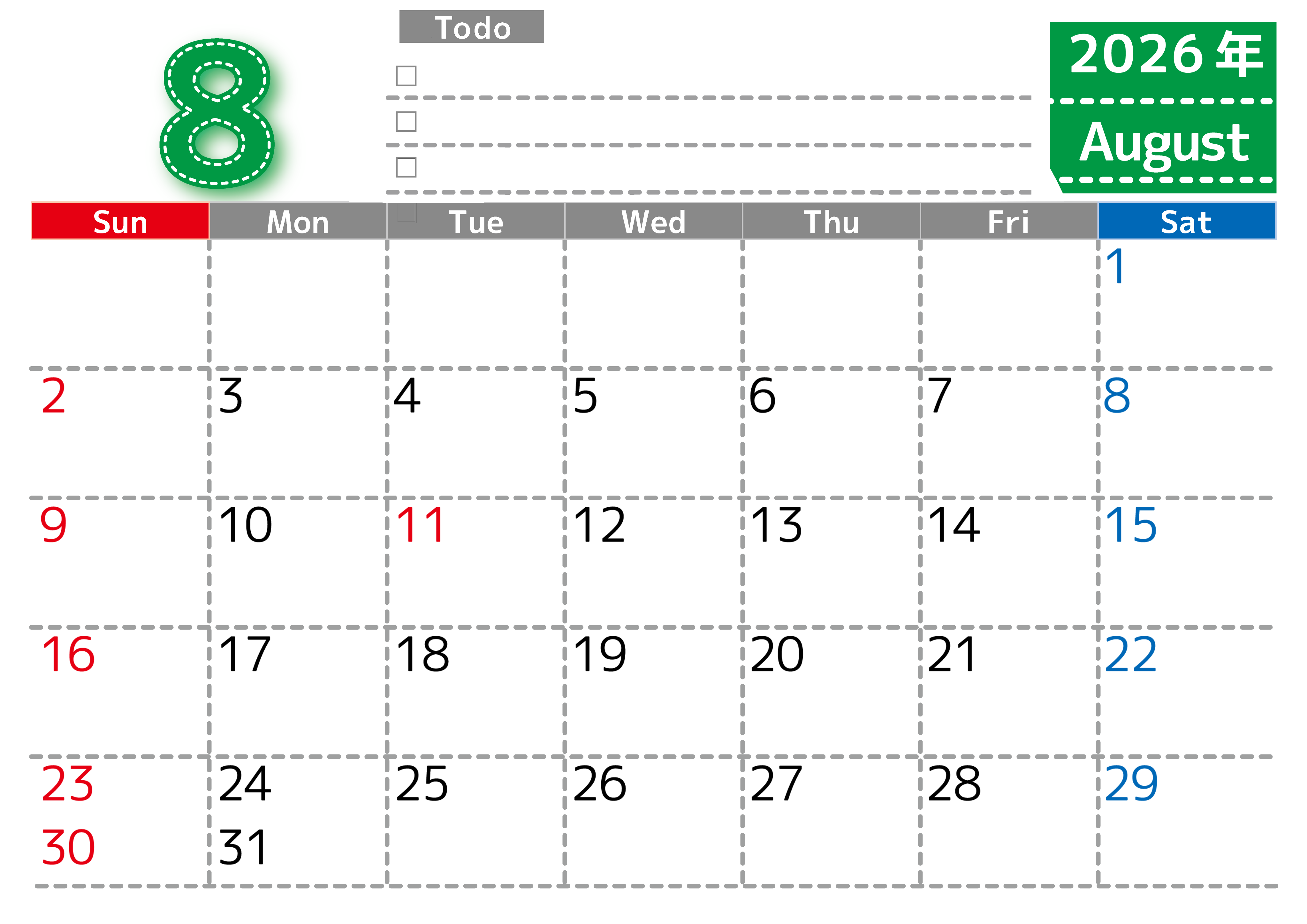 2026年・無料のカレンダーテンプレート 2026年8月カレンダーは横型日曜始まり♪使い方がシンプルなToDoリストも♪ダウンロード無料(2026-01470800) 素材状デザイン王 2025年4月12日 2026年8月カレンダーは横型日曜始まりです。使い方がシンプルなToDoリストも魅力的です。ダウンロードは無料で簡単です。(2026-01470800) 8月 横型のカレンダー 日曜始まり ToDoリスト カレンダーデザイン-0147