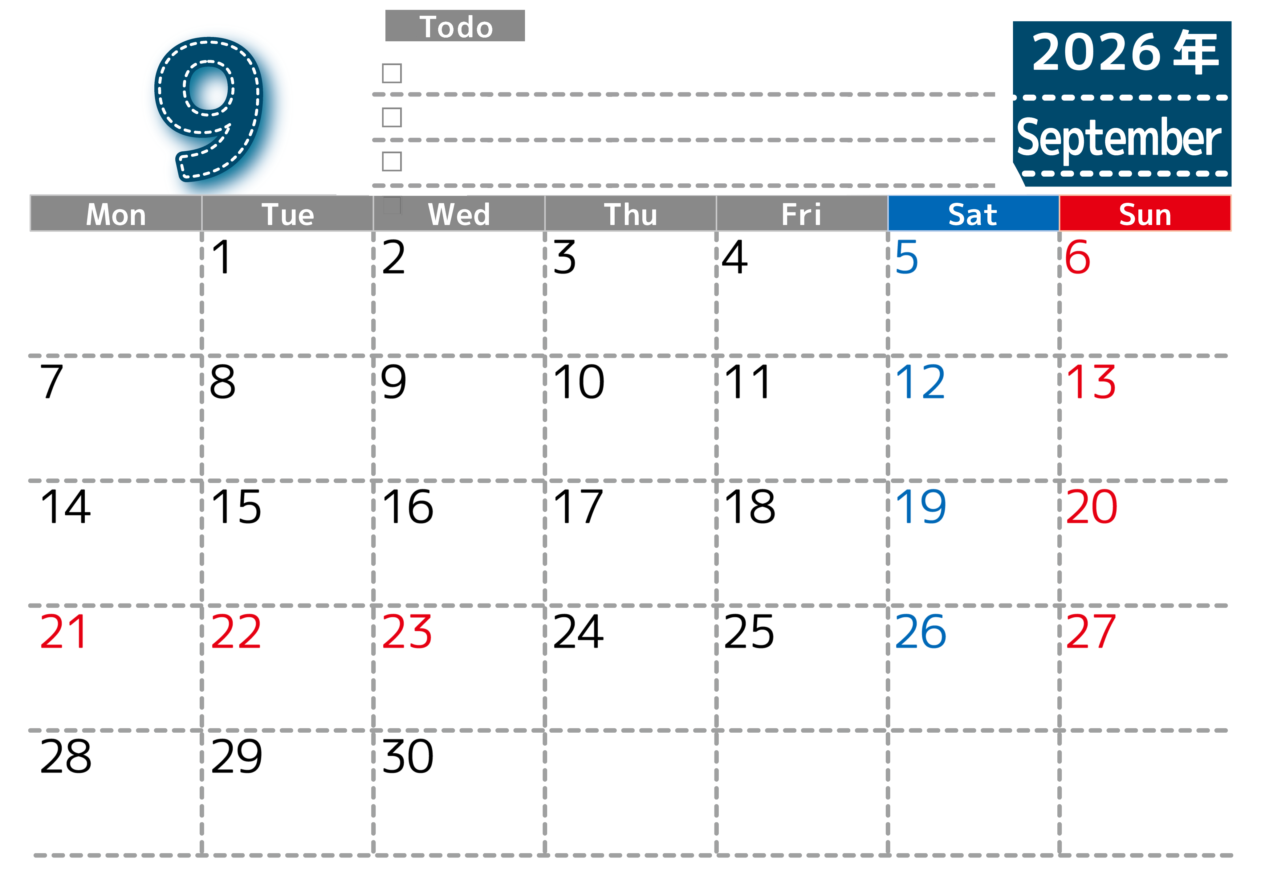 2026年・無料のカレンダーテンプレート 2026年9月カレンダーは横型月曜始まり♪使い方がシンプルなToDoリストも♪ダウンロード無料(2026-01470901) 素材状デザイン王 2025年4月12日 2026年9月カレンダーは横型月曜始まりです。使い方がシンプルなToDoリストも魅力的です。ダウンロードは無料で簡単です。(2026-01470901) 9月 横型のカレンダー 月曜始まり ToDoリスト カレンダーデザイン-0147
