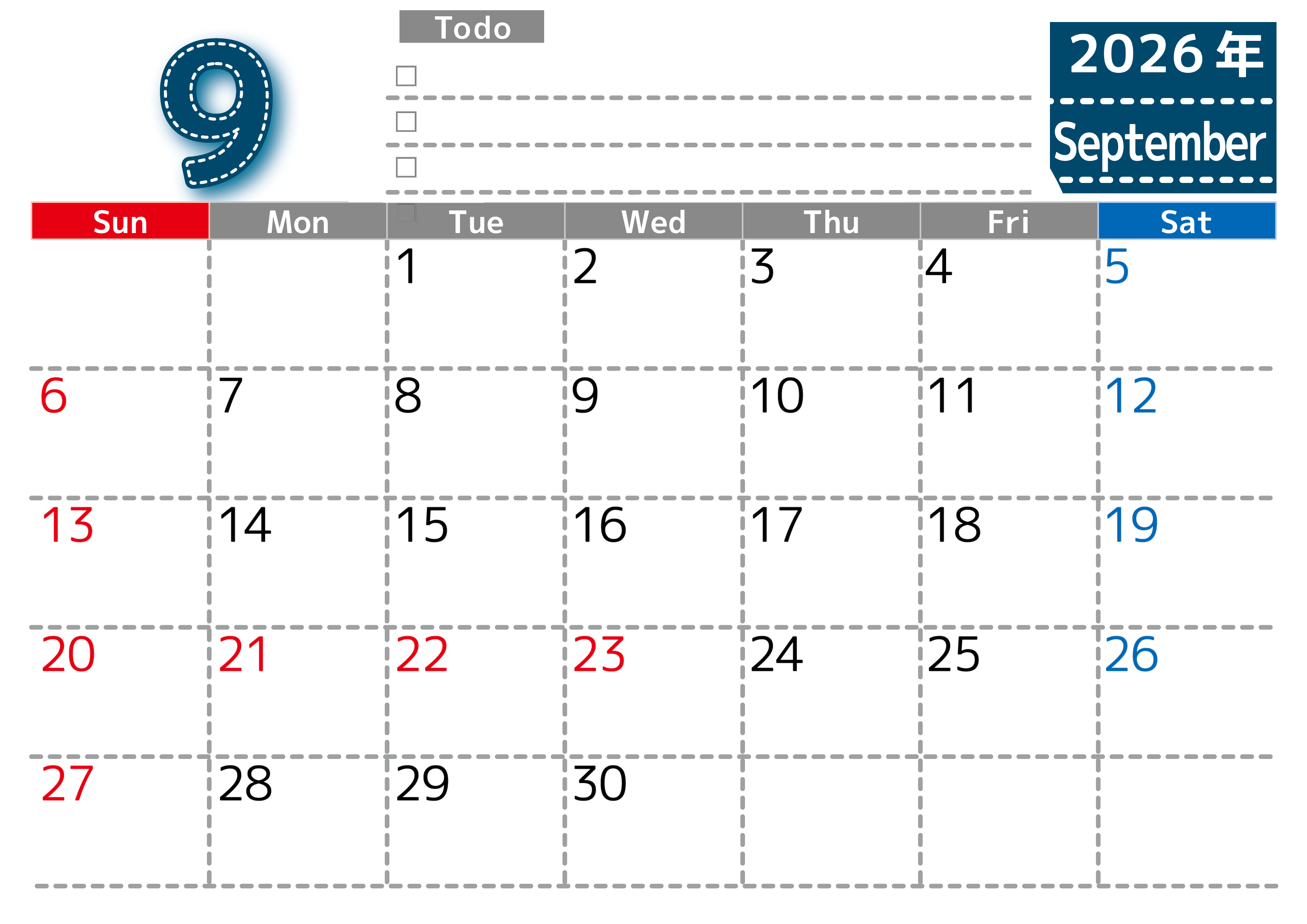 2026年・無料のカレンダーテンプレート 2026年9月カレンダーは横型日曜始まり♪使い方がシンプルなToDoリストも♪ダウンロード無料(2026-01470900) 素材状デザイン王 2025年4月12日 2026年9月カレンダーは横型日曜始まりです。使い方がシンプルなToDoリストも魅力的です。ダウンロードは無料で簡単です。(2026-01470900) 9月 横型のカレンダー 日曜始まり ToDoリスト カレンダーデザイン-0147
