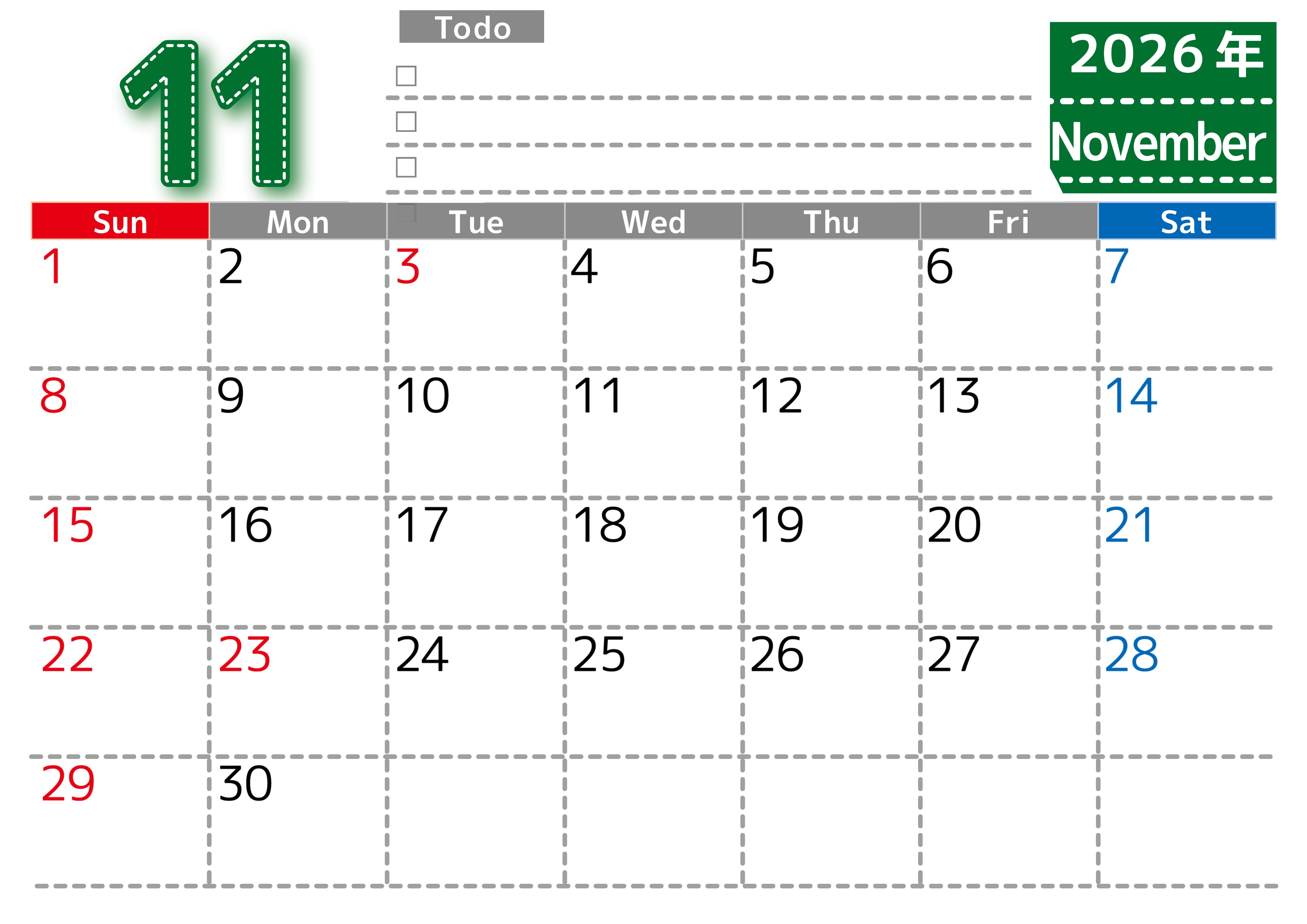 2026年・無料のカレンダーテンプレート 2026年11月カレンダーは横型日曜始まり♪使い方がシンプルなToDoリストも♪ダウンロード無料(2026-01471100) 素材状デザイン王 2025年4月12日 2026年11月カレンダーは横型日曜始まりです。使い方がシンプルなToDoリストも魅力的です。ダウンロードは無料で簡単です。(2026-01471100) 11月 横型のカレンダー 日曜始まり ToDoリスト カレンダーデザイン-0147