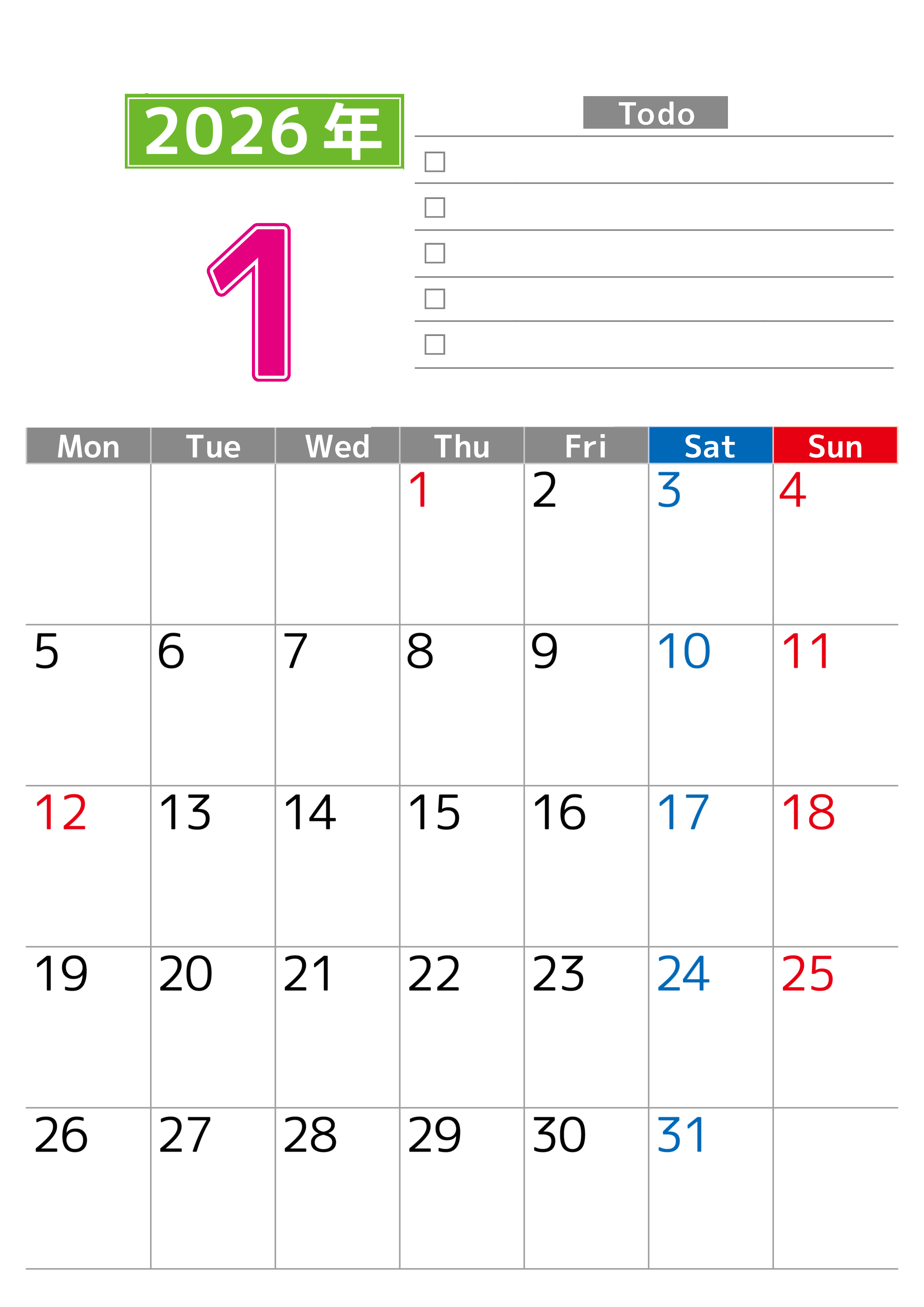 2026年・無料のカレンダーテンプレート 2026年1月カレンダーは縦型月曜始まりで使いやすい!ToDoリストに色々書き込んでモチベ維持:無料(2026-01480111) 素材状デザイン王 2025年4月12日 2026年1月カレンダーは縦型月曜始まりで使いやすいです。ToDoリストに色々書き込んでモチベーションの維持もしやすくなります。無料でダウンロードをしてすぐ印刷が可能です。)(2026-01480111) 1月 縦型のカレンダー 月曜始まり ToDoリスト カレンダーデザイン-0148