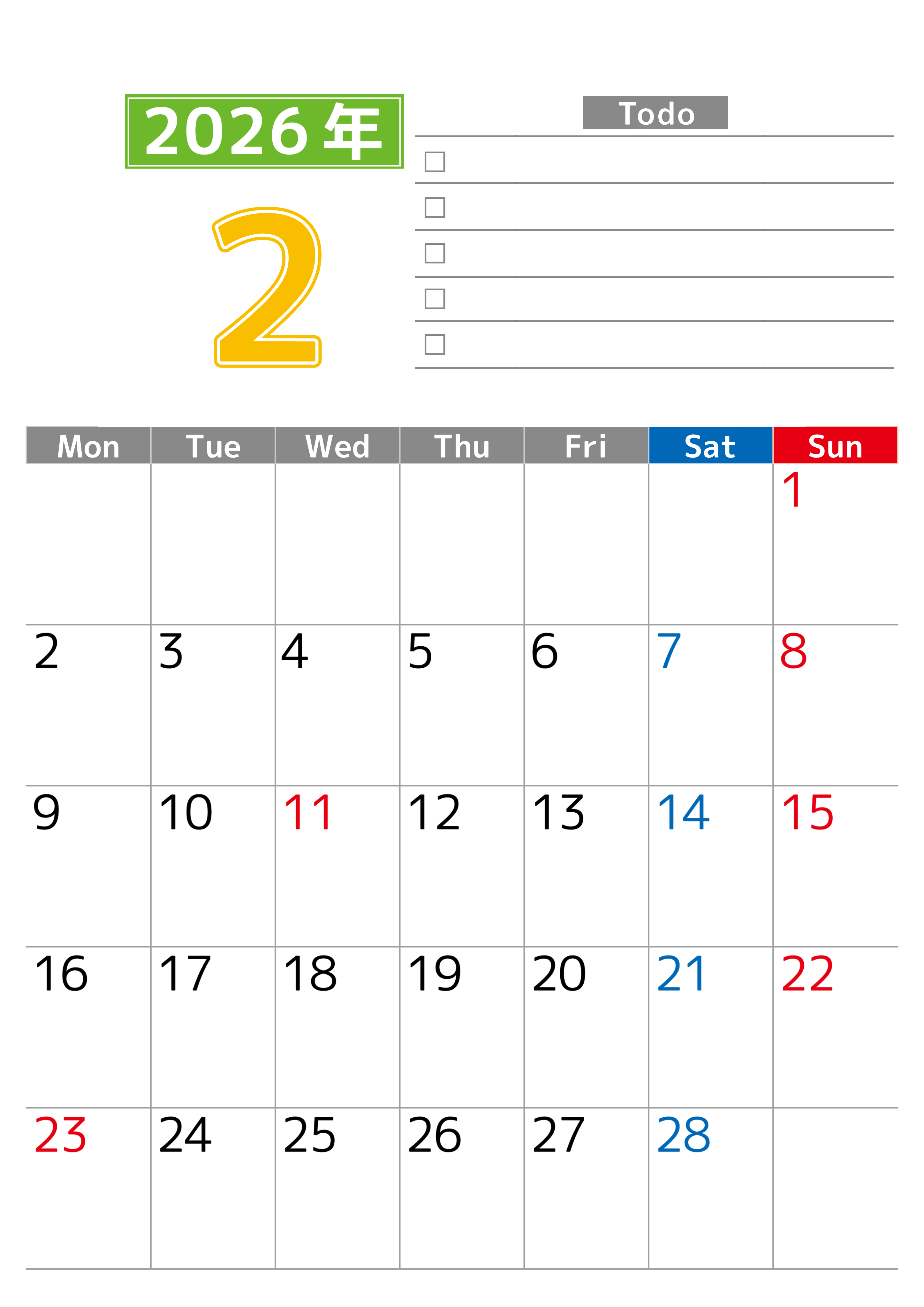 2026年・無料のカレンダーテンプレート 2026年2月カレンダーは縦型月曜始まりで使いやすい!ToDoリストに色々書き込んでモチベ維持:無料(2026-01480211) 素材状デザイン王 2025年4月12日 2026年2月カレンダーは縦型月曜始まりで使いやすいです。ToDoリストに色々書き込んでモチベーションの維持もしやすくなります。無料でダウンロードをしてすぐ印刷が可能です。)(2026-01480211) 2月 縦型のカレンダー 月曜始まり ToDoリスト カレンダーデザイン-0148