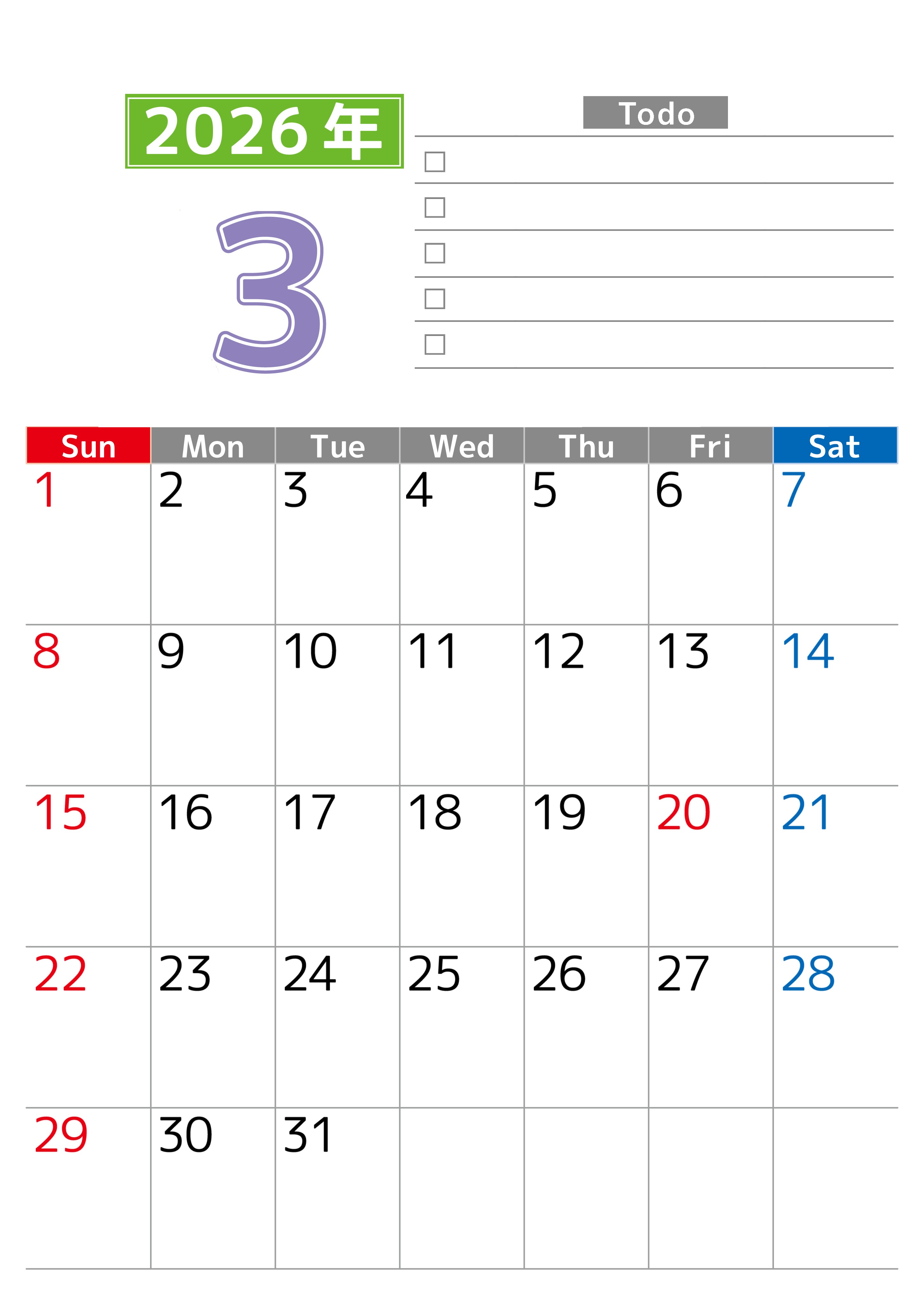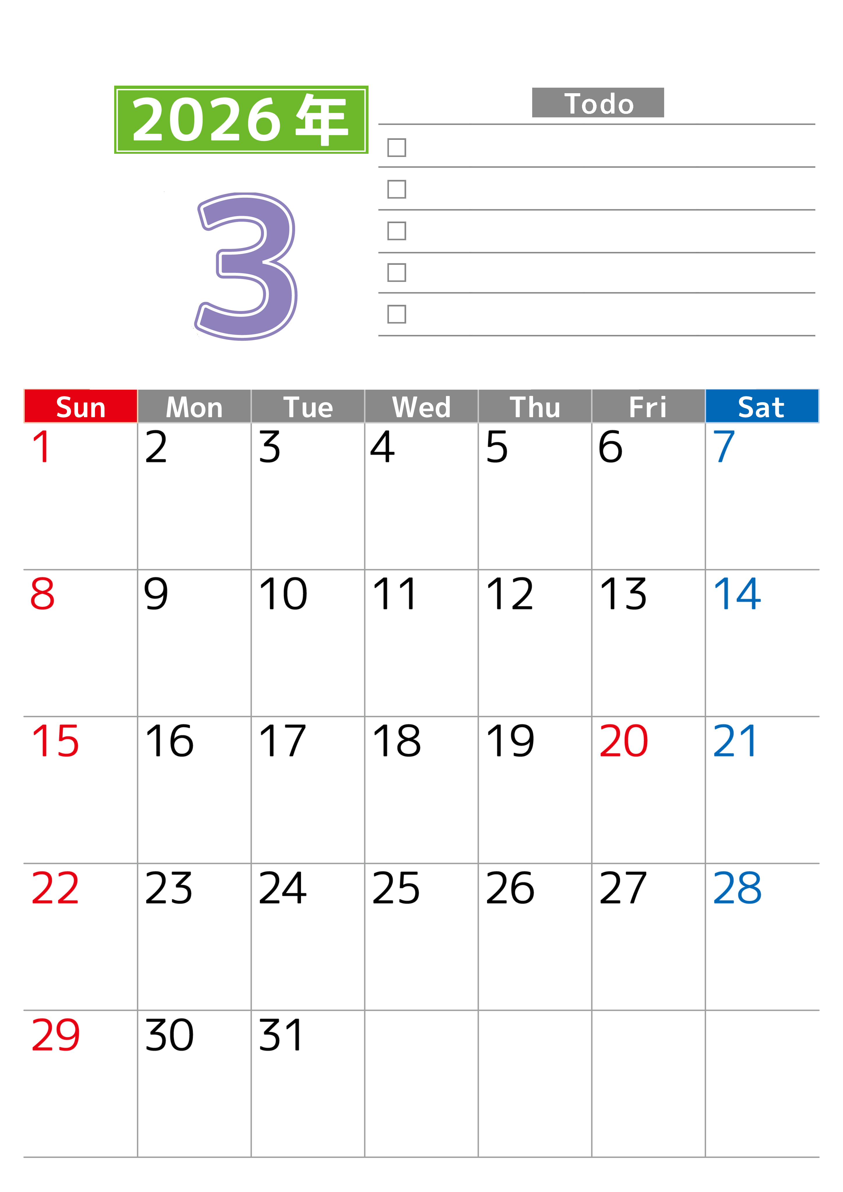 2026年・無料のカレンダーテンプレート 2026年3月カレンダーは縦型日曜始まりで使いやすい!ToDoリストに色々書き込んでモチベ維持:無料(2026-01480310) 素材状デザイン王 2025年4月12日 2026年3月カレンダーは縦型日曜始まりで使いやすいです。ToDoリストに色々書き込んでモチベーションの維持もしやすくなります。無料でダウンロードをしてすぐ印刷が可能です。)(2026-01480310) 3月 縦型のカレンダー 日曜始まり ToDoリスト カレンダーデザイン-0148