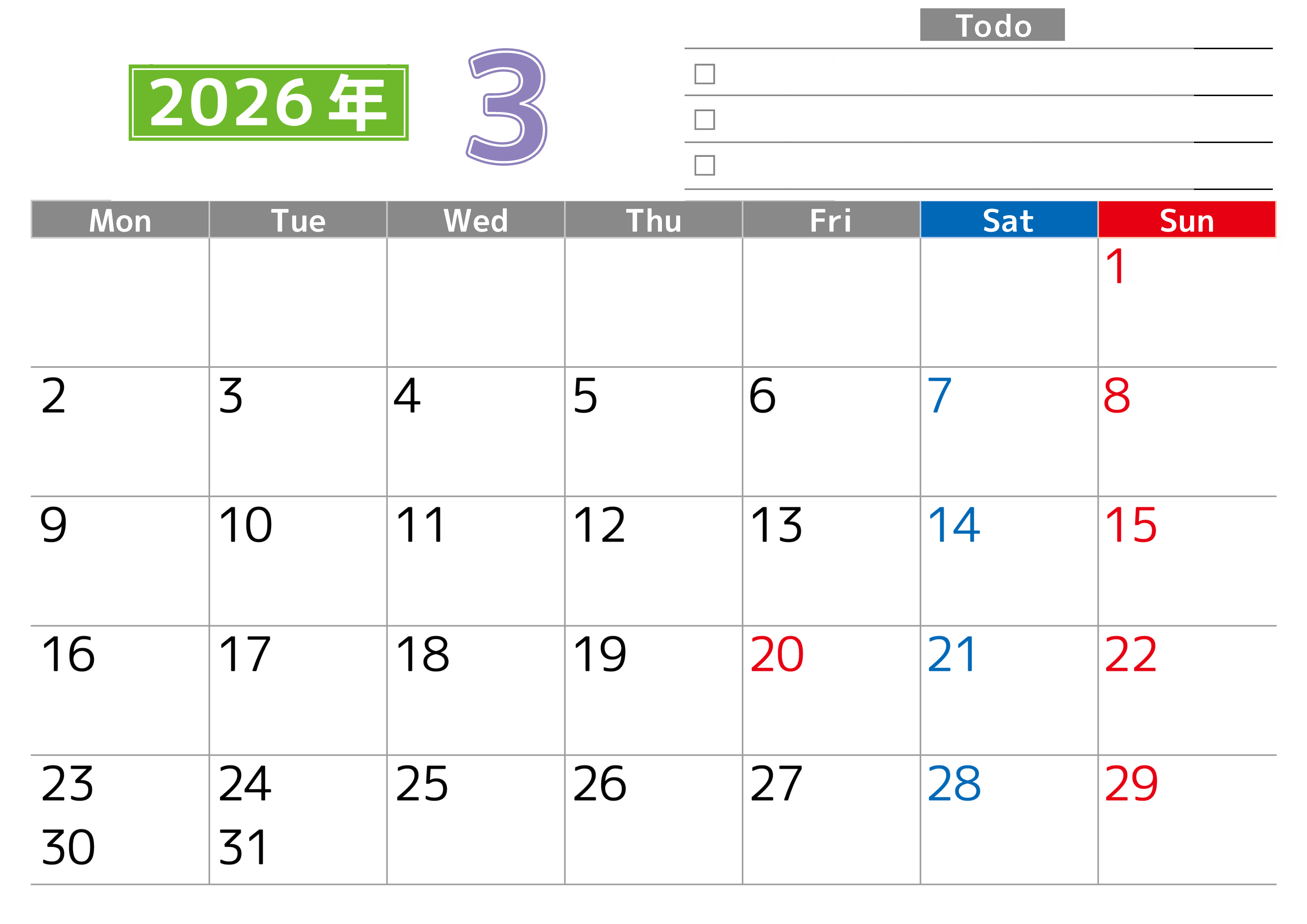 2026年・無料のカレンダーテンプレート 2026年3月カレンダーは横型月曜始まりで使いやすい!ToDoリストに色々書き込んでモチベ維持:無料(2026-01480301) 素材状デザイン王 2025年4月12日 2026年3月カレンダーは横型月曜始まりで使いやすいです。ToDoリストに色々書き込んでモチベーションの維持もしやすくなります。無料でダウンロードをしてすぐ印刷が可能です。)(2026-01480301) 3月 横型のカレンダー 月曜始まり ToDoリスト カレンダーデザイン-0148