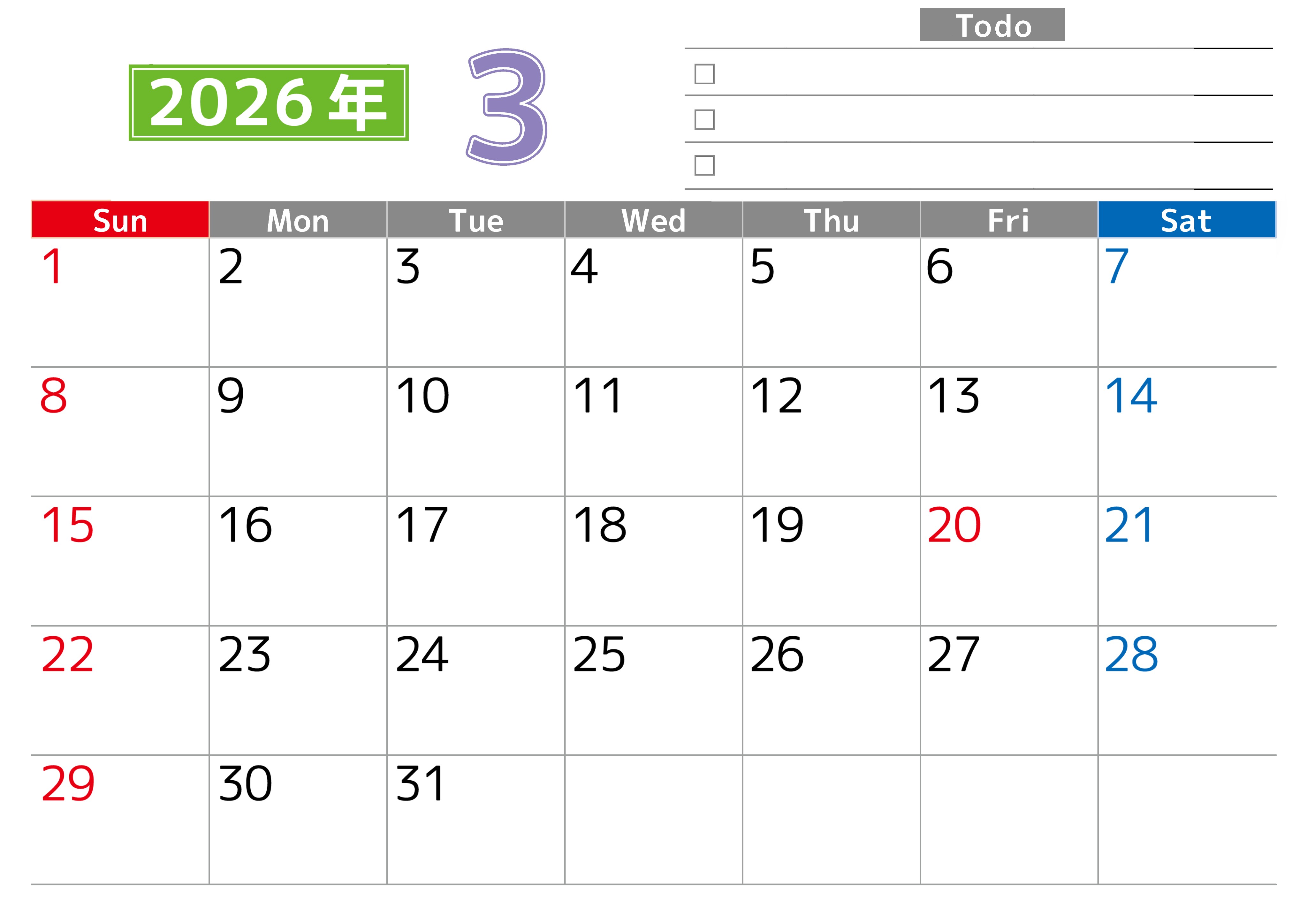 2026年・無料のカレンダーテンプレート 2026年3月カレンダーは横型日曜始まりで使いやすい!ToDoリストに色々書き込んでモチベ維持:無料(2026-01480300) 素材状デザイン王 2025年4月12日 2026年3月カレンダーは横型日曜始まりで使いやすいです。ToDoリストに色々書き込んでモチベーションの維持もしやすくなります。無料でダウンロードをしてすぐ印刷が可能です。)(2026-01480300) 3月 横型のカレンダー 日曜始まり ToDoリスト カレンダーデザイン-0148