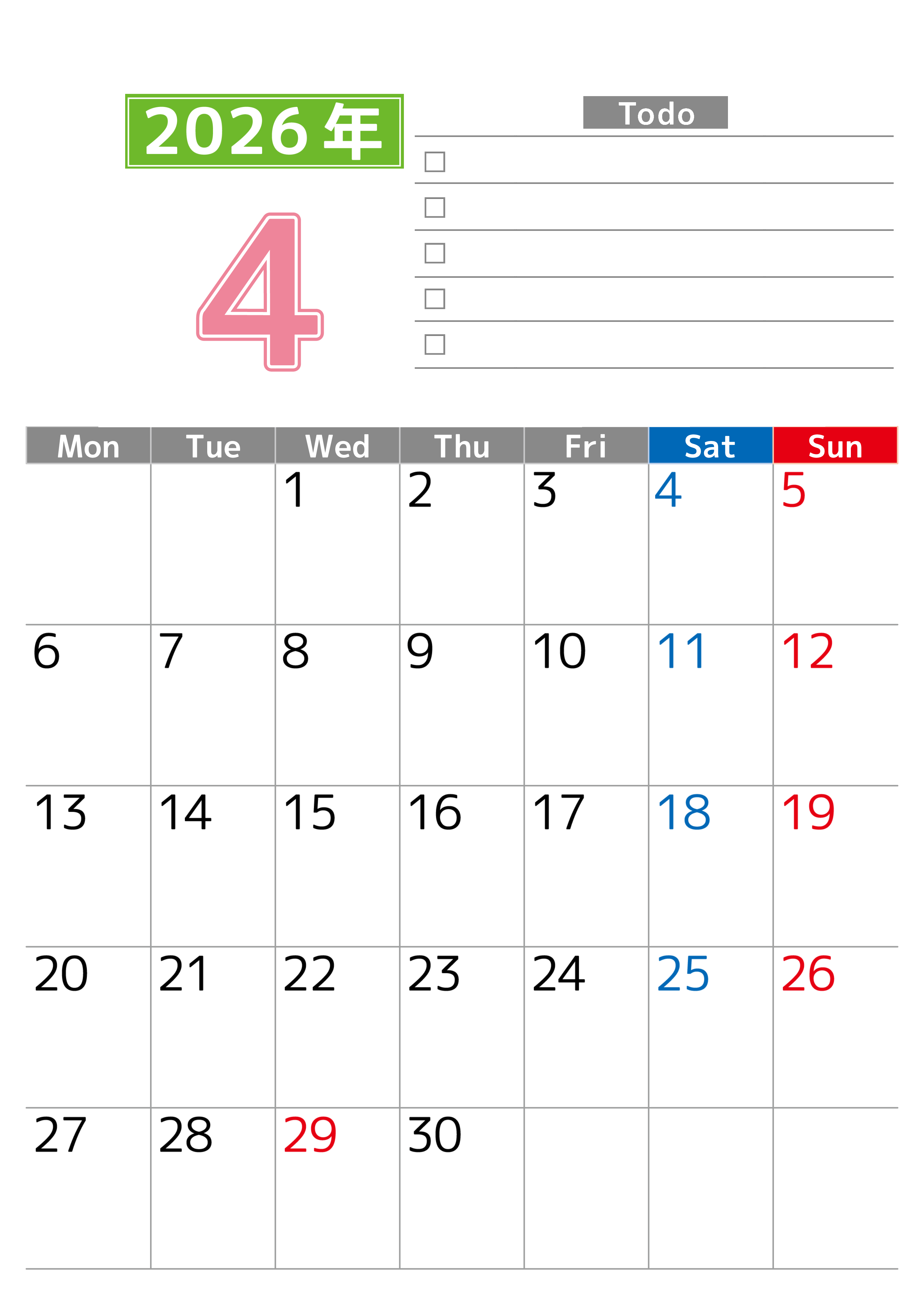 2026年4月カレンダーは縦型月曜始まりで使いやすい!ToDoリストに色々書き込んでモチベ維持:無料(2026-01480411)