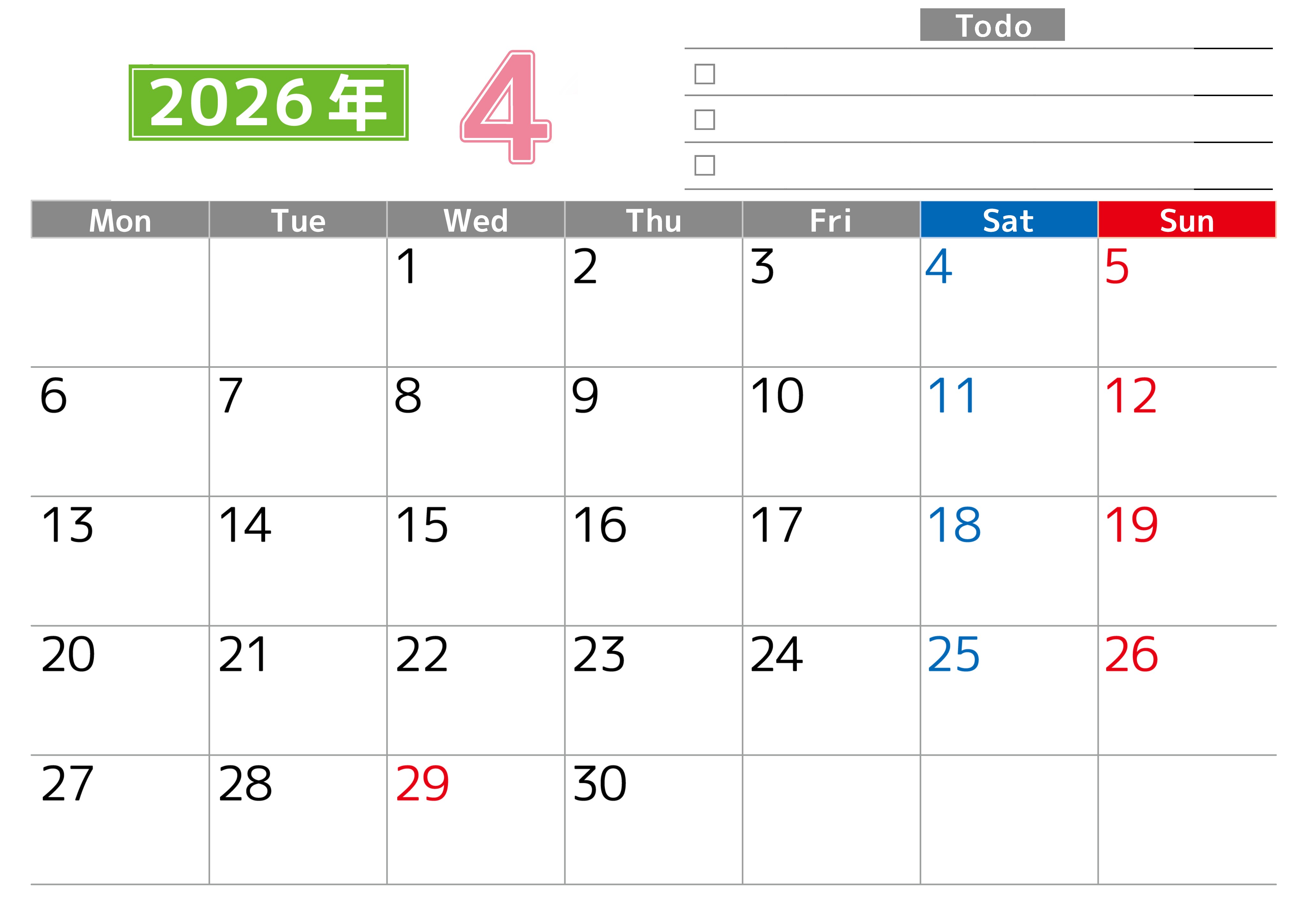 2026年・無料のカレンダーテンプレート 2026年4月カレンダーは横型月曜始まりで使いやすい!ToDoリストに色々書き込んでモチベ維持:無料(2026-01480401) 素材状デザイン王 2025年4月12日 2026年4月カレンダーは横型月曜始まりで使いやすいです。ToDoリストに色々書き込んでモチベーションの維持もしやすくなります。無料でダウンロードをしてすぐ印刷が可能です。)(2026-01480401) 4月 横型のカレンダー 月曜始まり ToDoリスト カレンダーデザイン-0148