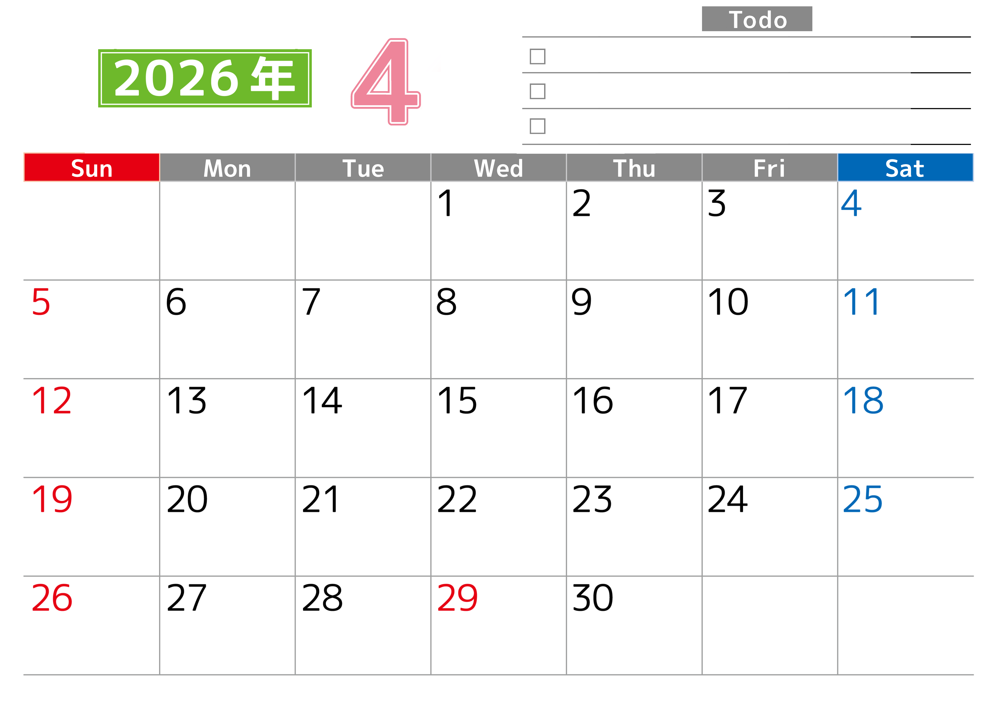 2026年・無料のカレンダーテンプレート 2026年4月カレンダーは横型日曜始まりで使いやすい!ToDoリストに色々書き込んでモチベ維持:無料(2026-01480400) 素材状デザイン王 2025年4月12日 2026年4月カレンダーは横型日曜始まりで使いやすいです。ToDoリストに色々書き込んでモチベーションの維持もしやすくなります。無料でダウンロードをしてすぐ印刷が可能です。)(2026-01480400) 4月 横型のカレンダー 日曜始まり ToDoリスト カレンダーデザイン-0148