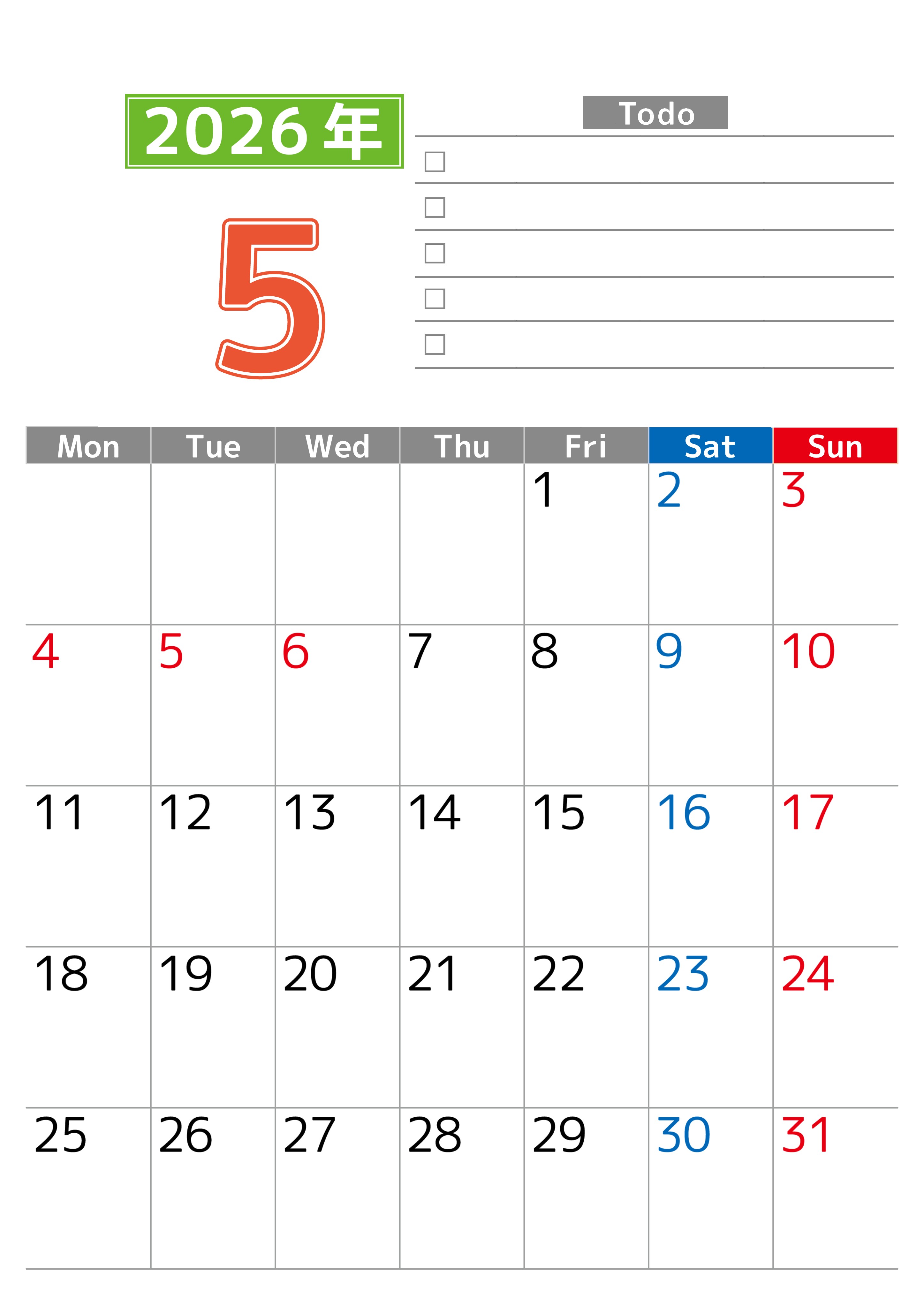 2026年・無料のカレンダーテンプレート 2026年5月カレンダーは縦型月曜始まりで使いやすい!ToDoリストに色々書き込んでモチベ維持:無料(2026-01480511) 素材状デザイン王 2025年4月12日 2026年5月カレンダーは縦型月曜始まりで使いやすいです。ToDoリストに色々書き込んでモチベーションの維持もしやすくなります。無料でダウンロードをしてすぐ印刷が可能です。)(2026-01480511) 5月 縦型のカレンダー 月曜始まり ToDoリスト カレンダーデザイン-0148