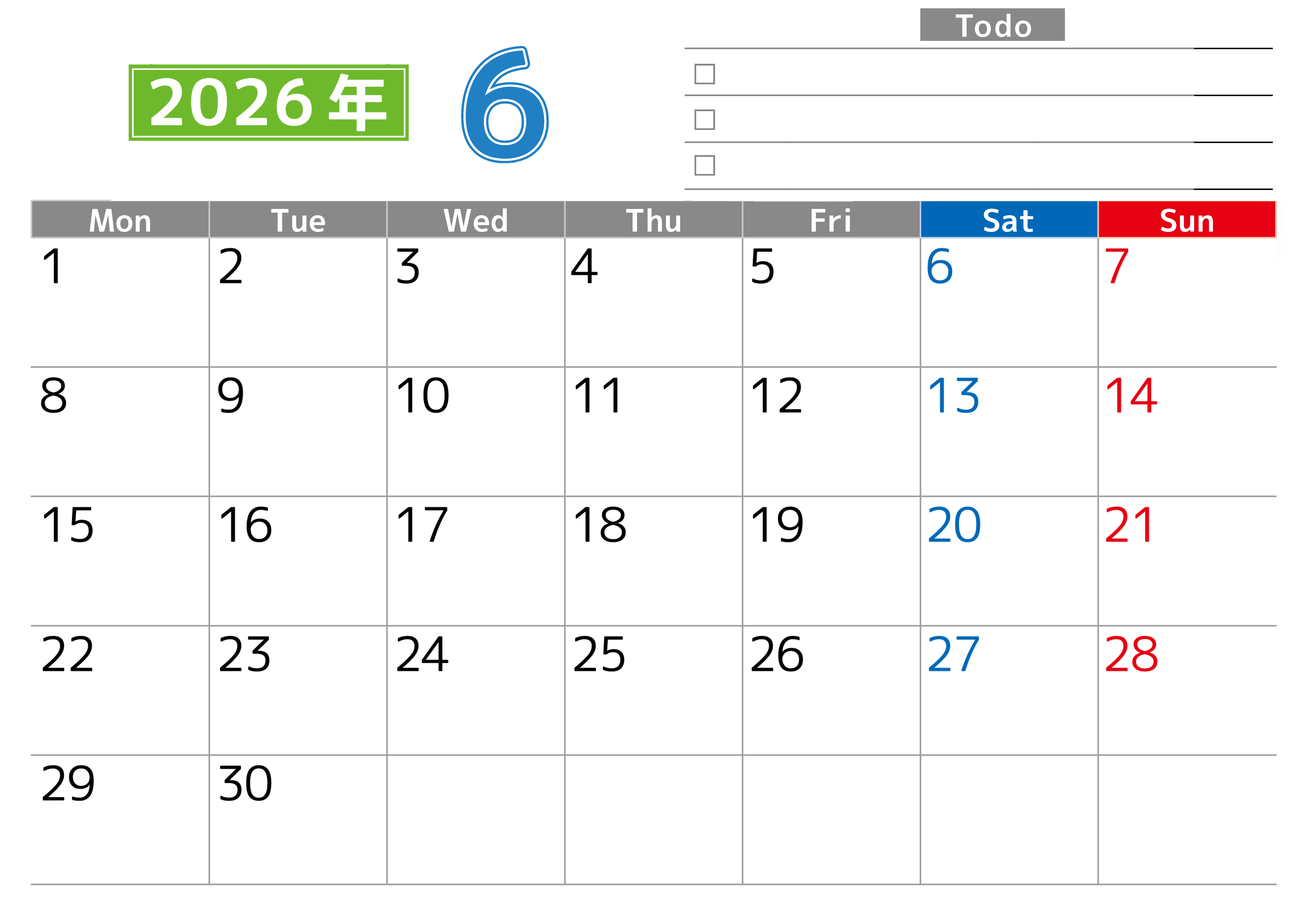 2026年・無料のカレンダーテンプレート 2026年6月カレンダーは横型月曜始まりで使いやすい!ToDoリストに色々書き込んでモチベ維持:無料(2026-01480601) 素材状デザイン王 2025年4月12日 2026年6月カレンダーは横型月曜始まりで使いやすいです。ToDoリストに色々書き込んでモチベーションの維持もしやすくなります。無料でダウンロードをしてすぐ印刷が可能です。)(2026-01480601) 6月 横型のカレンダー 月曜始まり ToDoリスト カレンダーデザイン-0148