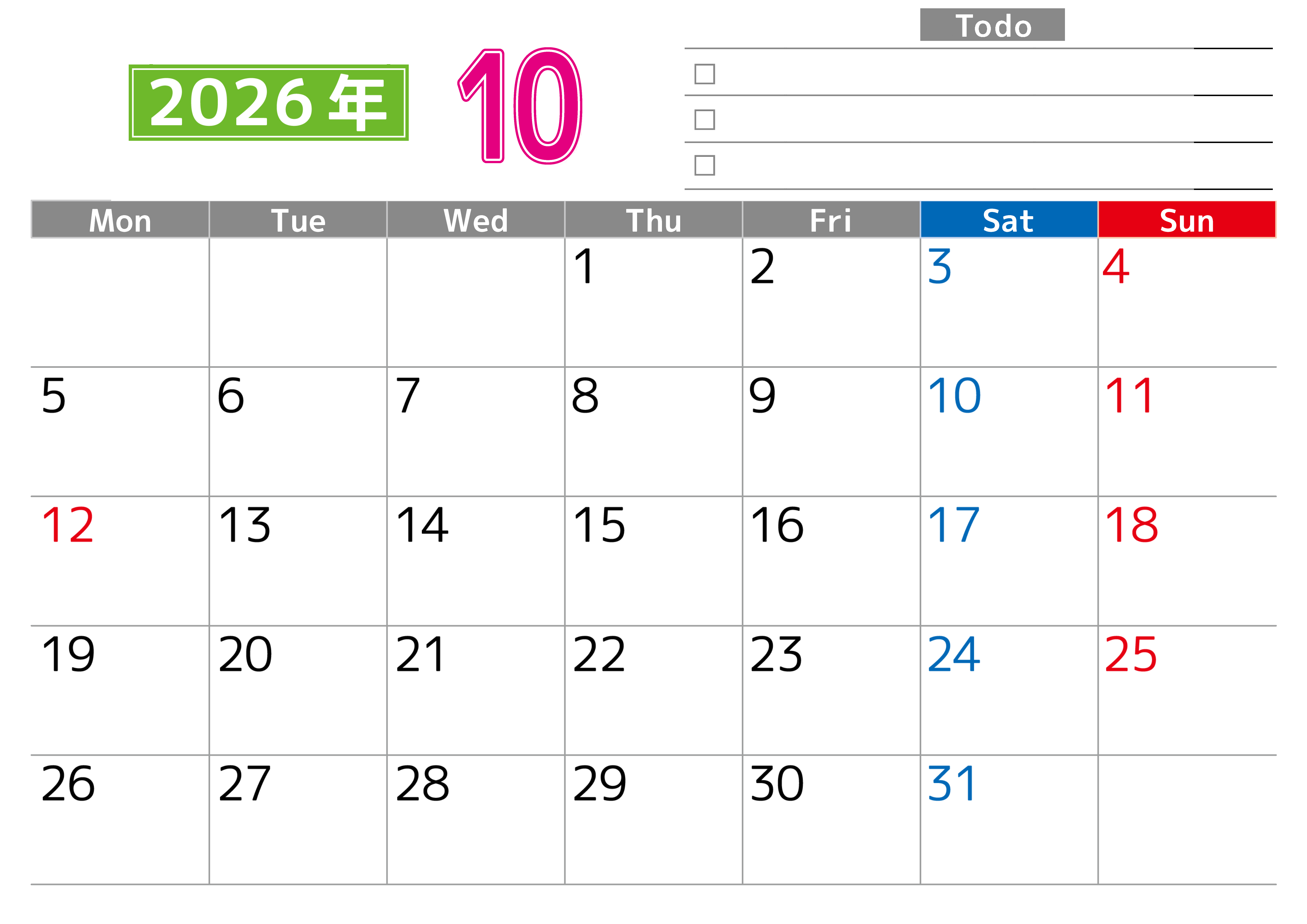 2026年・無料のカレンダーテンプレート 2026年10月カレンダーは横型月曜始まりで使いやすい!ToDoリストに色々書き込んでモチベ維持:無料(2026-01481001) 素材状デザイン王 2025年4月12日 2026年10月カレンダーは横型月曜始まりで使いやすいです。ToDoリストに色々書き込んでモチベーションの維持もしやすくなります。無料でダウンロードをしてすぐ印刷が可能です。)(2026-01481001) 10月 横型のカレンダー 月曜始まり ToDoリスト カレンダーデザイン-0148