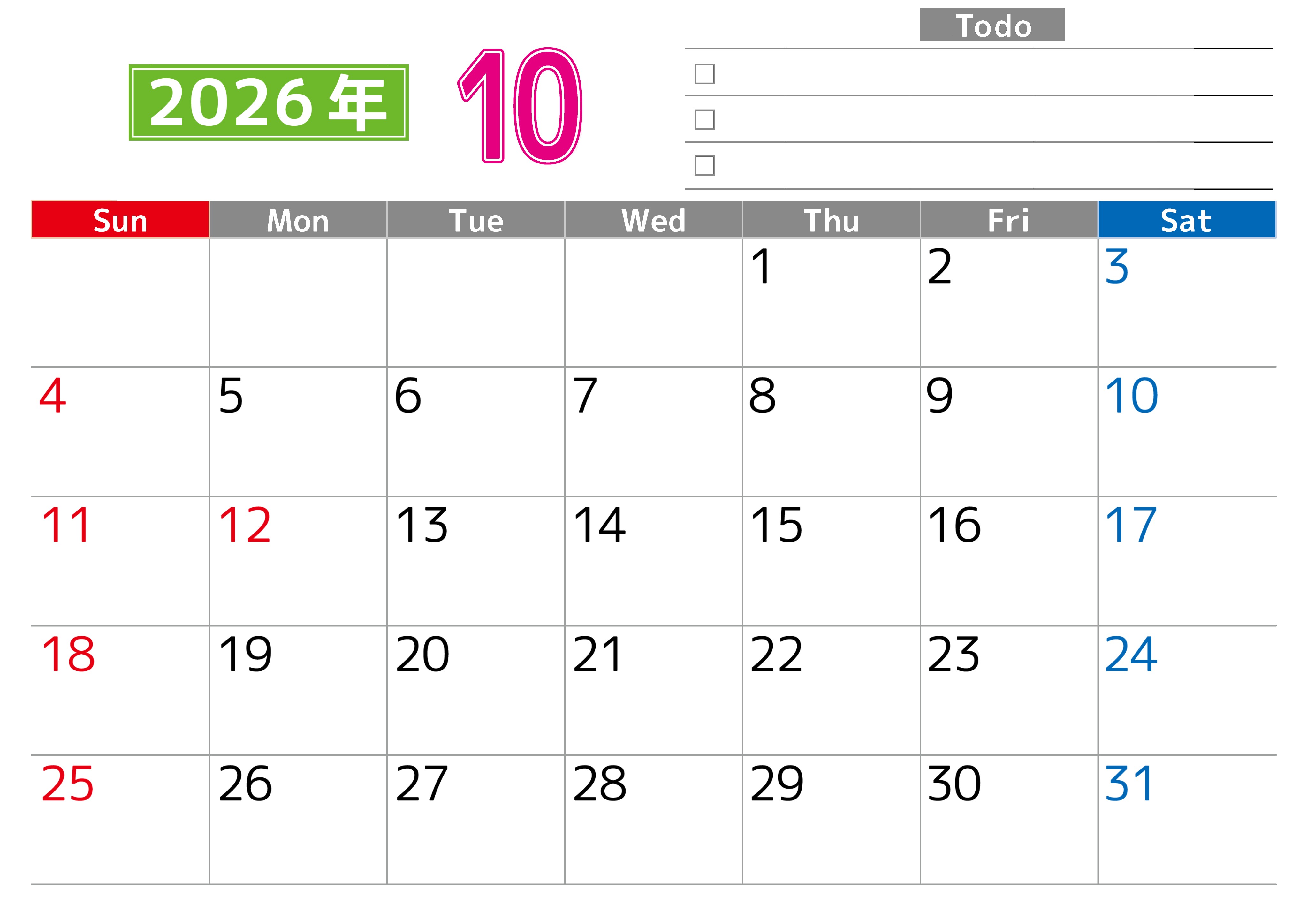 2026年10月カレンダーは横型日曜始まりで使いやすい!ToDoリストに色々書き込んでモチベ維持:無料(2026-01481000)